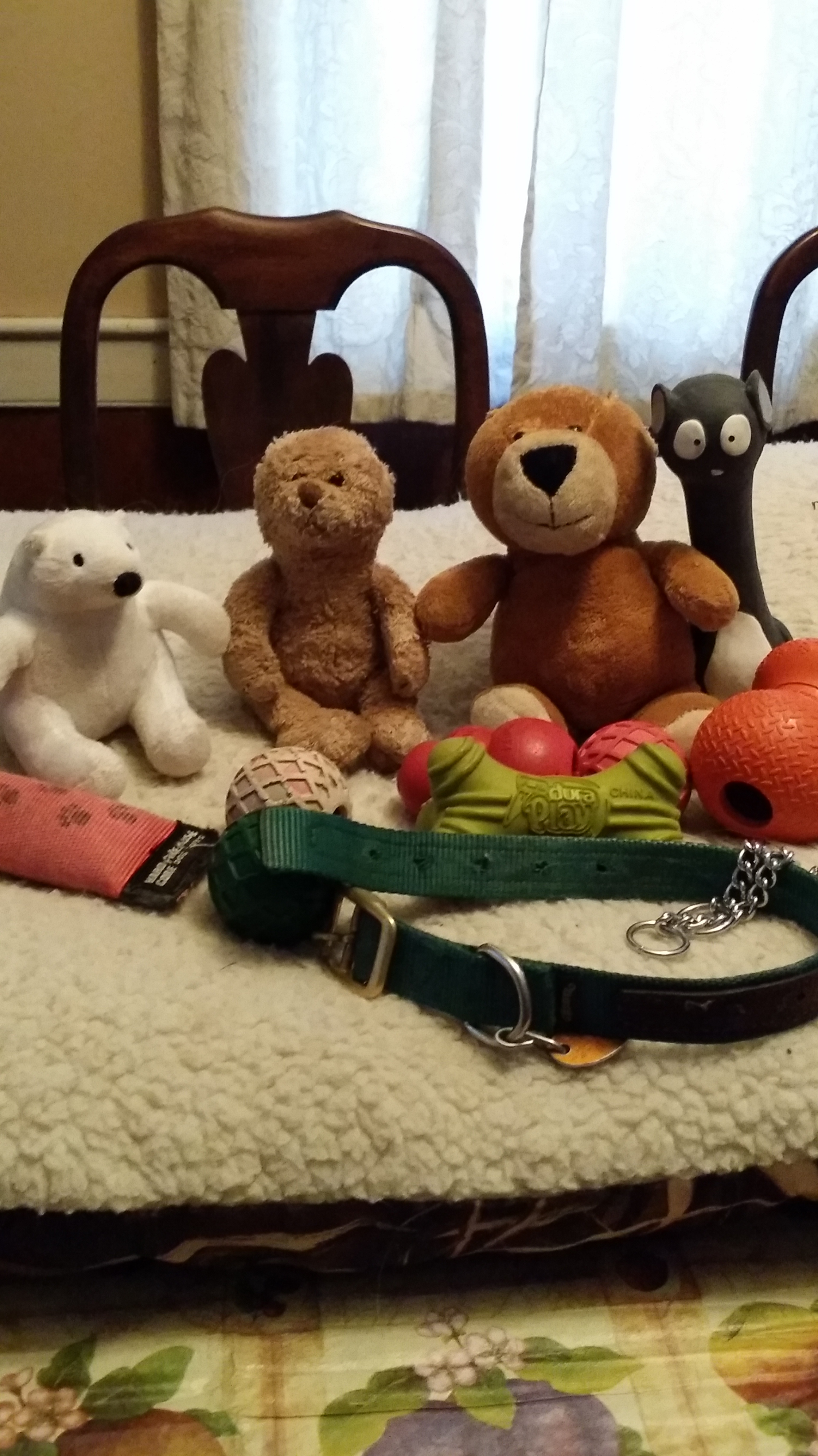 These are all of Blitz ‘ s belongings that came with him. There is a large fleece dog bed, a buckle collar, a choker collar, a retractable lead, and a whole host of toys. Also a box of biscuits and a large bag of dog food. Notice that the bears do not have ears. They don’t have tails either. Apparently Blitz likes his toys!