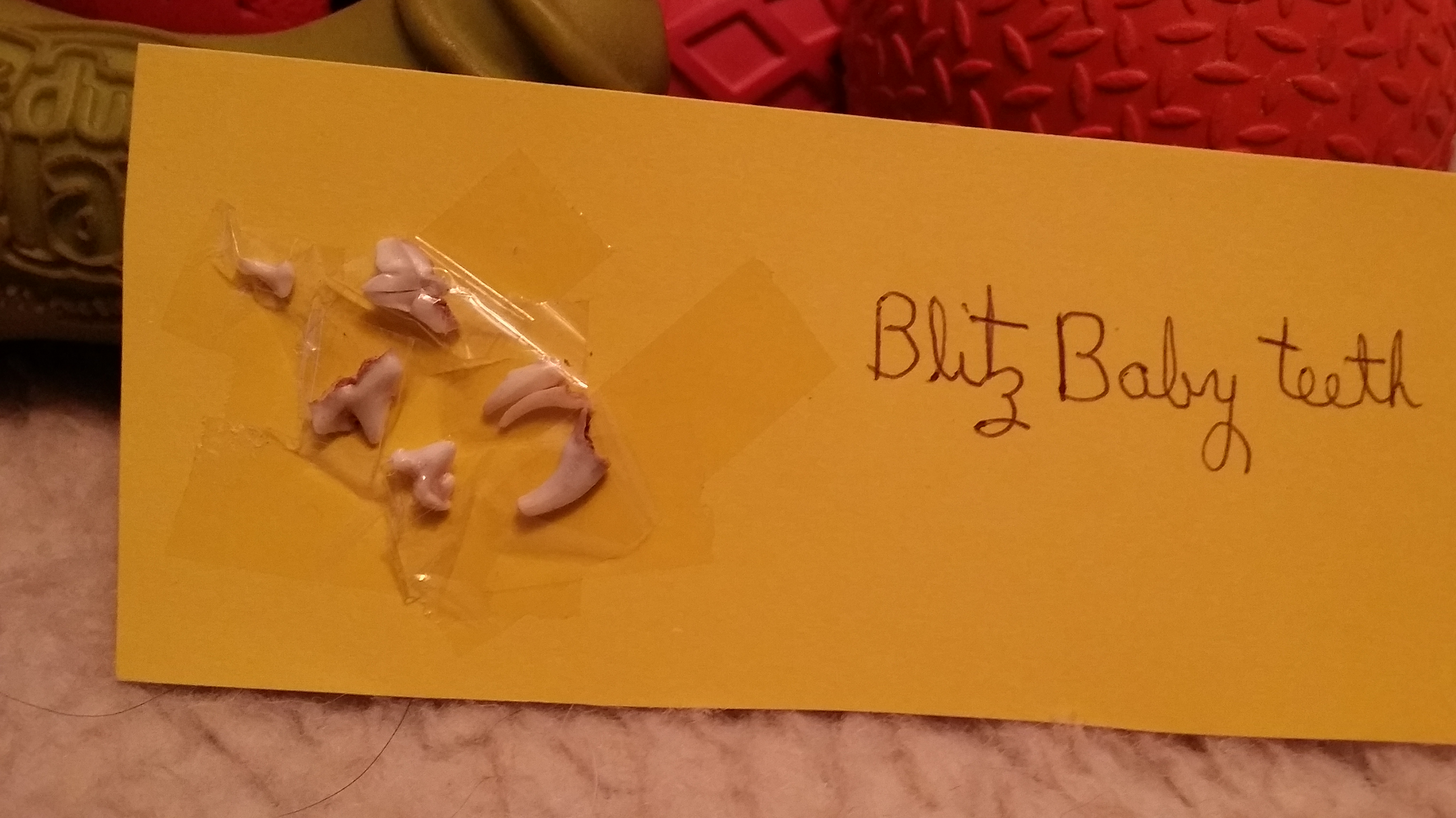 He also came with this picture of his mother, and his litter mate and himself at one day old. Blitz is the tiny brown one near the mother’s foot. And if that doesn’t convince you that he was loved, he was also sent to me with his baby teeth. They were lovingly kept and labeled.
