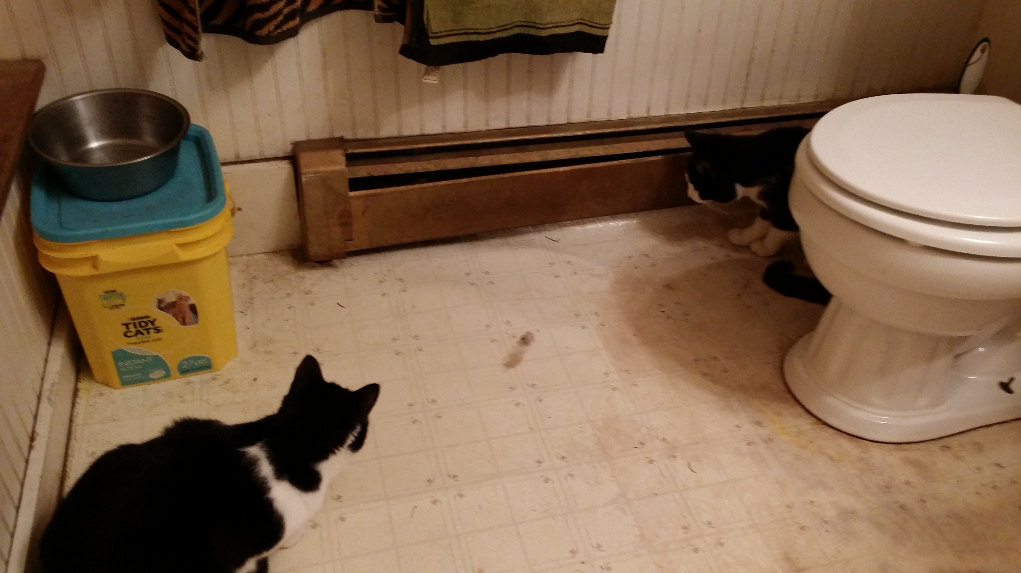 So it turned out that it was not a mouse that Harley and Morty were hunting. In fact it was a half grown squirrel. I don’t know how he managed to fit in that tiny space. The cover had to be removed from the heating baseboard before Mr. (Ms.?) Squirrel would come out. No small wonder with two fierce hunters waiting.