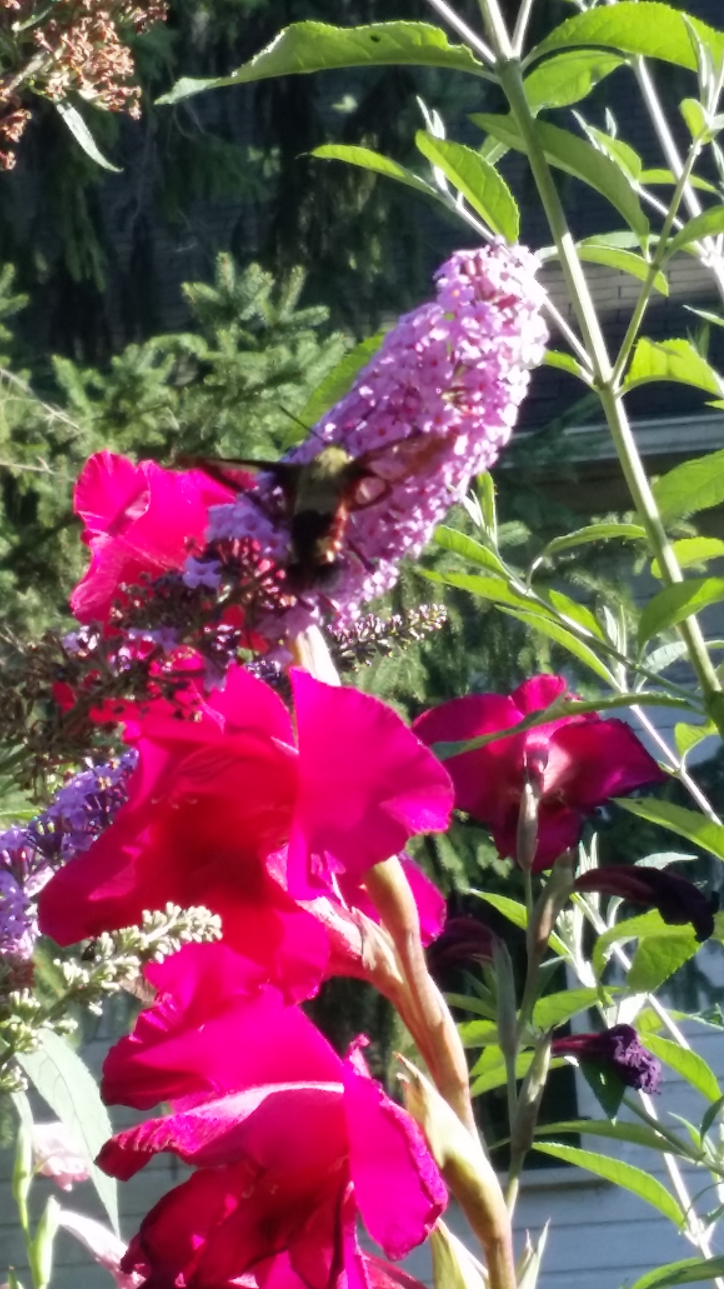 Butterflies are not the only thing this bush attracts though. It also draws in what is called a hummingbird moth. I only discovered these in recent years. At first glance it looks like a hummingbird. It is about half the size of a hummer but similar in shape and the wings move in the same manner as the bird. It also has similar brilliant colors. But this creature is a moth. Much as I like the hummingbirds, I think that I like the hummingbird moth even better. It is not as common and it is more unusual looking so it fascinates me. I will have to learn more about them because at this point all I know is that they are a cool looking moth and like the butterfly bush.