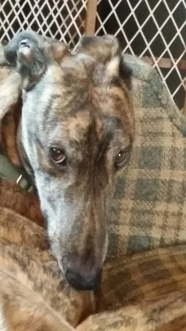 This is Cassius the greyhound. He is also tired out and peaceful after sharing all that activity with Baxter. Cassius is also a very high energy dog which is not typical for a greyhound.