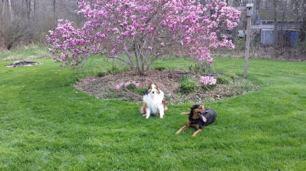 Spring has, at last, sprung here in Ohio. I finally have some pictures with flowers in them. And of course dogs. One of the benefits of teaching your dogs a few obedience commands is being able to pose them with things.