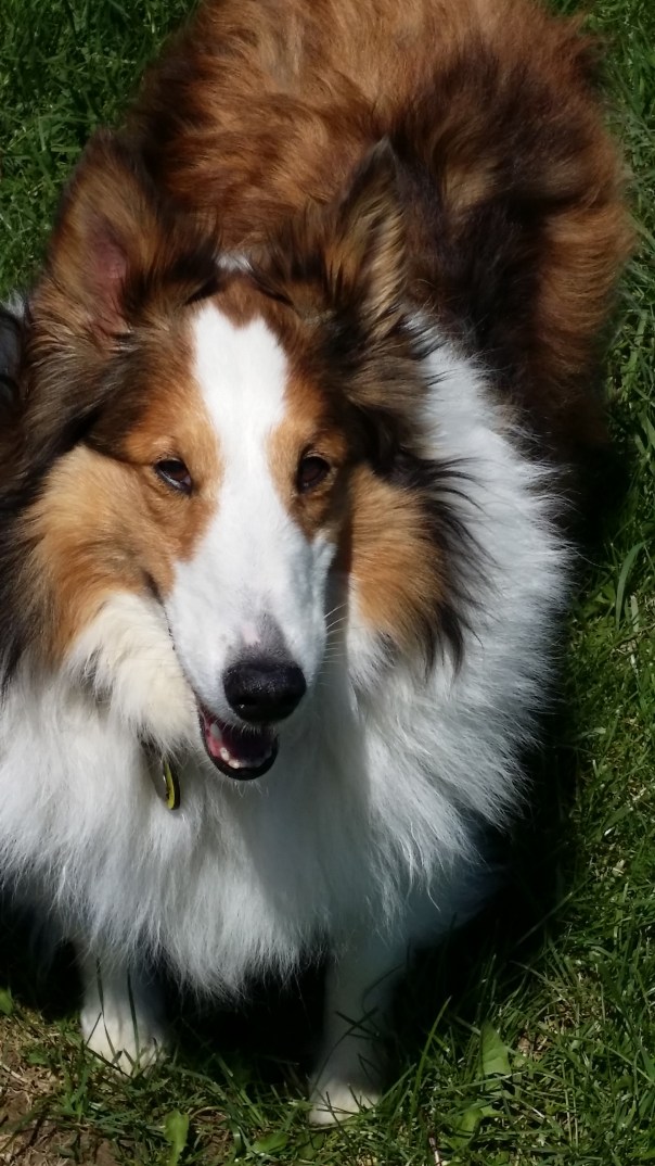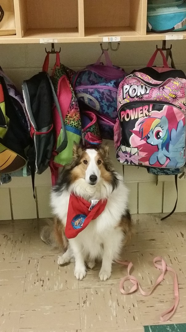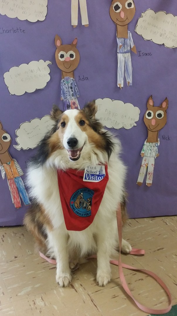 Think you can’t make a difference in someone’s life? Think again. Everyone can make a difference, even dogs! This is Shelby, my registered therapy dog, sitting outside the school where we go read to the kindergarteners. You can see that she’s quite proud to be wearing her “I’m a School Visitor” badge. We visit here once a month and I think that we teach the kids that reading is fun and dogs are fun. And accepting.