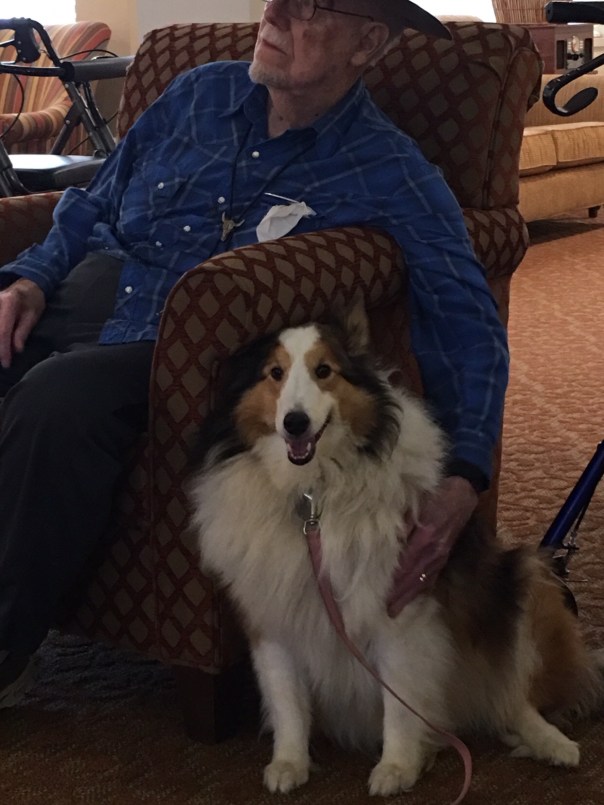 Hello friends! I want to share my good time with you. Shelby, Nikki, Baxter, and I had a fun time visiting the nursing home last evening. Or should I say, visiting with friends. You can see Shelby had a good time. She was smiling to show her “toofers” while she got a belly rub. It was one of several belly rubs.