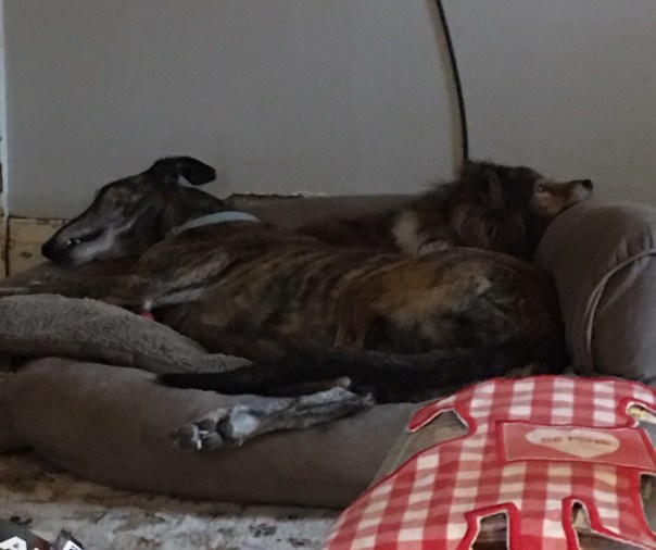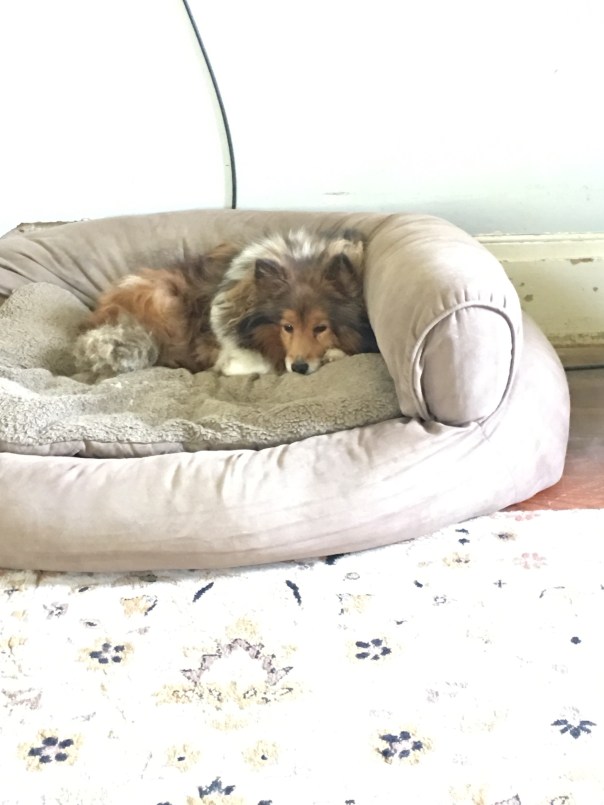 This is what we saw for the past few weeks. Our littlest dog (under 20 lbs.) taking up all of the big dog bed. The other, bigger dogs would stand there staring. Then they would pace around and come back to stare again at Nikki. She did not budge. Our greyhound Cassius could spend fair amounts of time staring at her, to no avail. Finally, the last two days, I have seen this.
