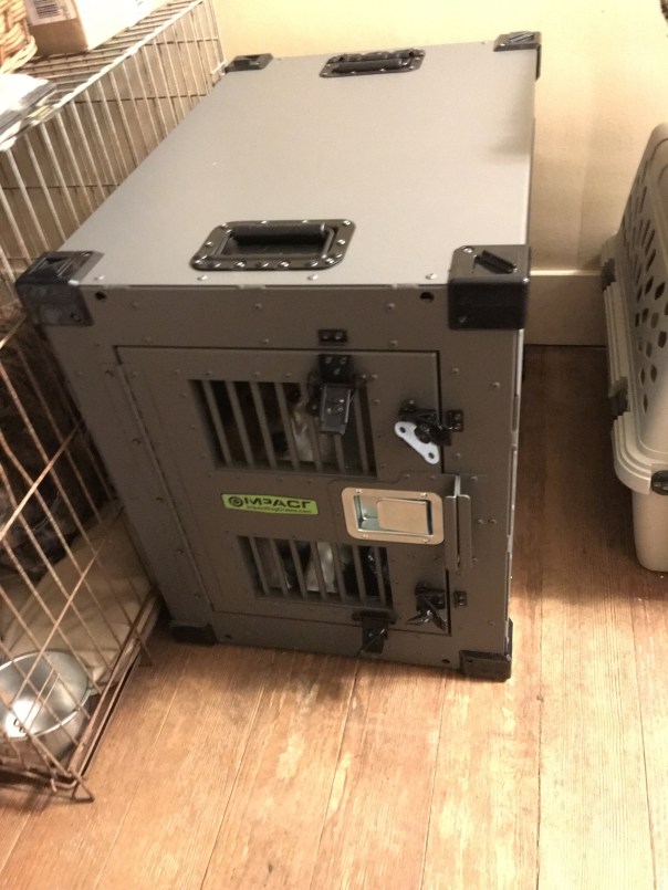 So I pursued the Impact crate. It is made of aircraft grade metal with marine quality butterfly latches and a large metal main door latch. It has many, small ventilation holes to prevent the dog from getting its mouth in them. The turn around time was approximately three weeks. This is a small, family owned company that makes the product on demand. And then 5-7 days to ship from Idaho to Ohio. This seemed an eternity.