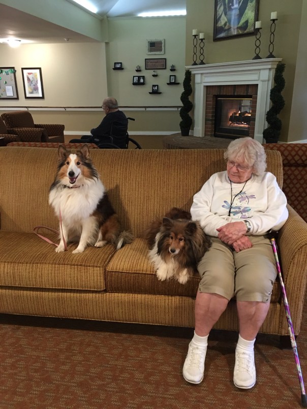 Shelby and I have put in many trips to visit at nursing facilities. She has earned the title TDIA (Therapy Dogs International Active) and is well on her way to the next title. She will “go visit” on command. She will hold a sit-stay will I put chairs away after a visit. We have done reading to kindergarteners, we have visited with college students to de-stress.
