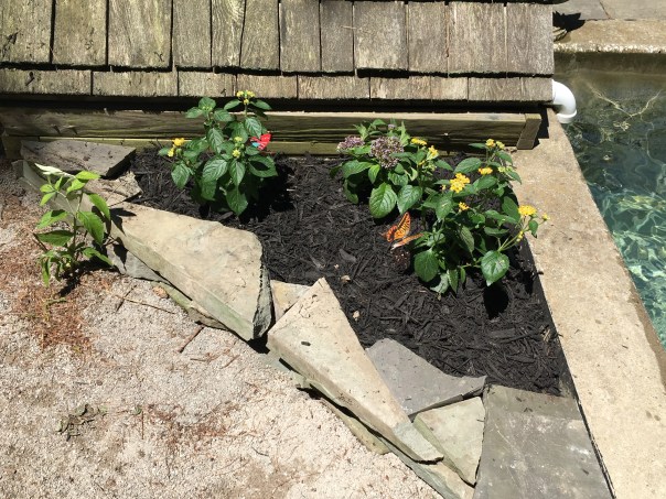 What do you do when you have a spare hour or so and some extra stone? You put in a new flower bed. Of course then you have to drive to the store for plants. These are lantana and heliotrope, marked down at the local grocery. They attract butterflies according to the tag.