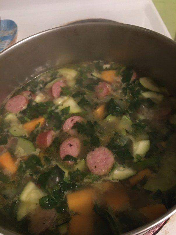 I cooked some sweet white onion in olive oil until it was soft. Then I added the broth which I spiced with salt, pepper, onion and garlic powders, dried garden basil, and oregano. While this simmered lightly, I went out to the garden and cut some Swiss Chard. It is still growing even though we had frost last night. It is a hardy vegetable. I sliced the stems, chopped the leaves, and added both to the pot. From the pantry I added a can of garbanzo beans and some bronze cut penne pasta, along with two links of sliced Italian chicken sausage. All of this simmered together for two hours. Part of the secret to delicious soup is this long, slow simmer. It allows the flavors to to meld and become one.