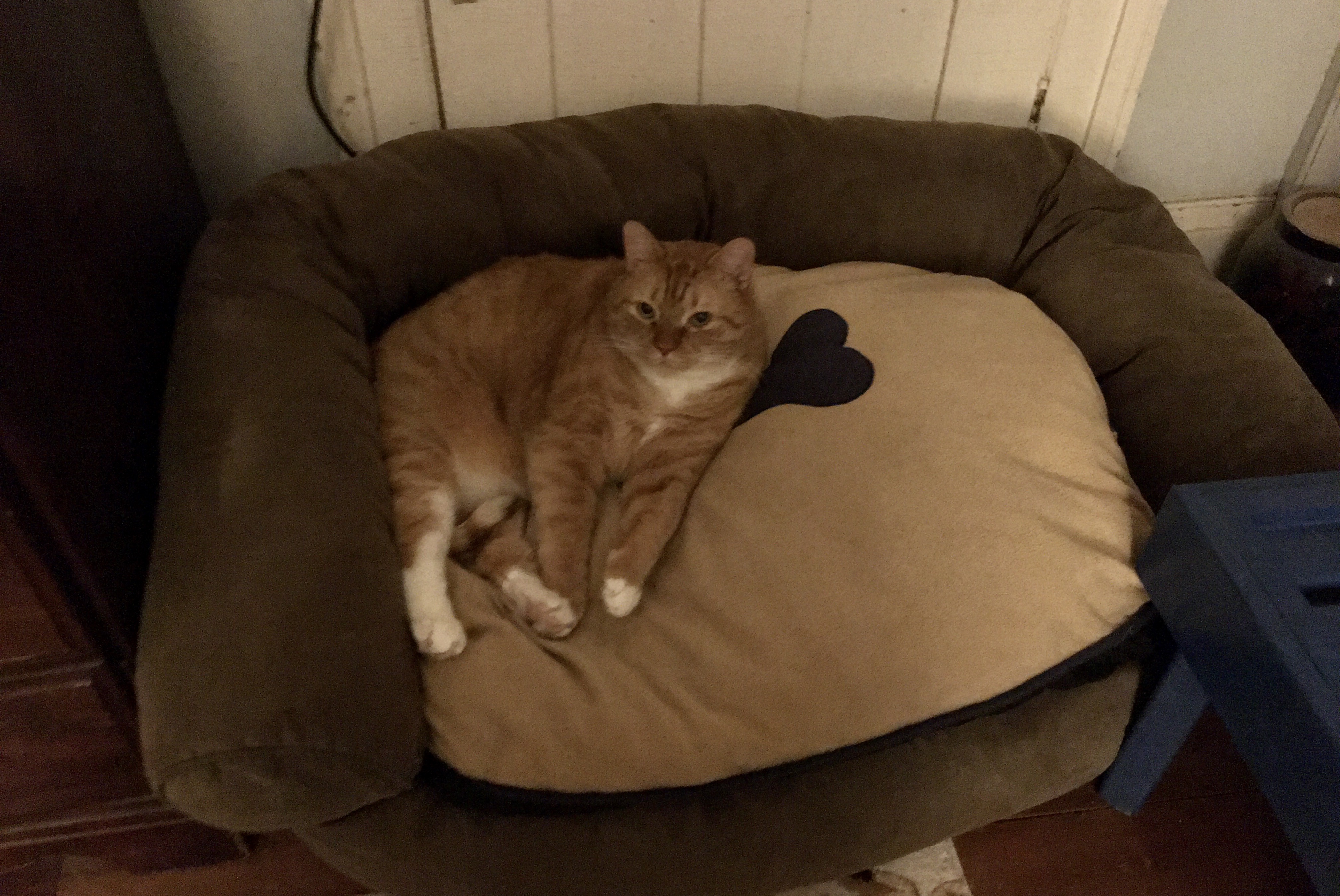The freshly laundered, large greyhound size bed has been commandeered by the cat.