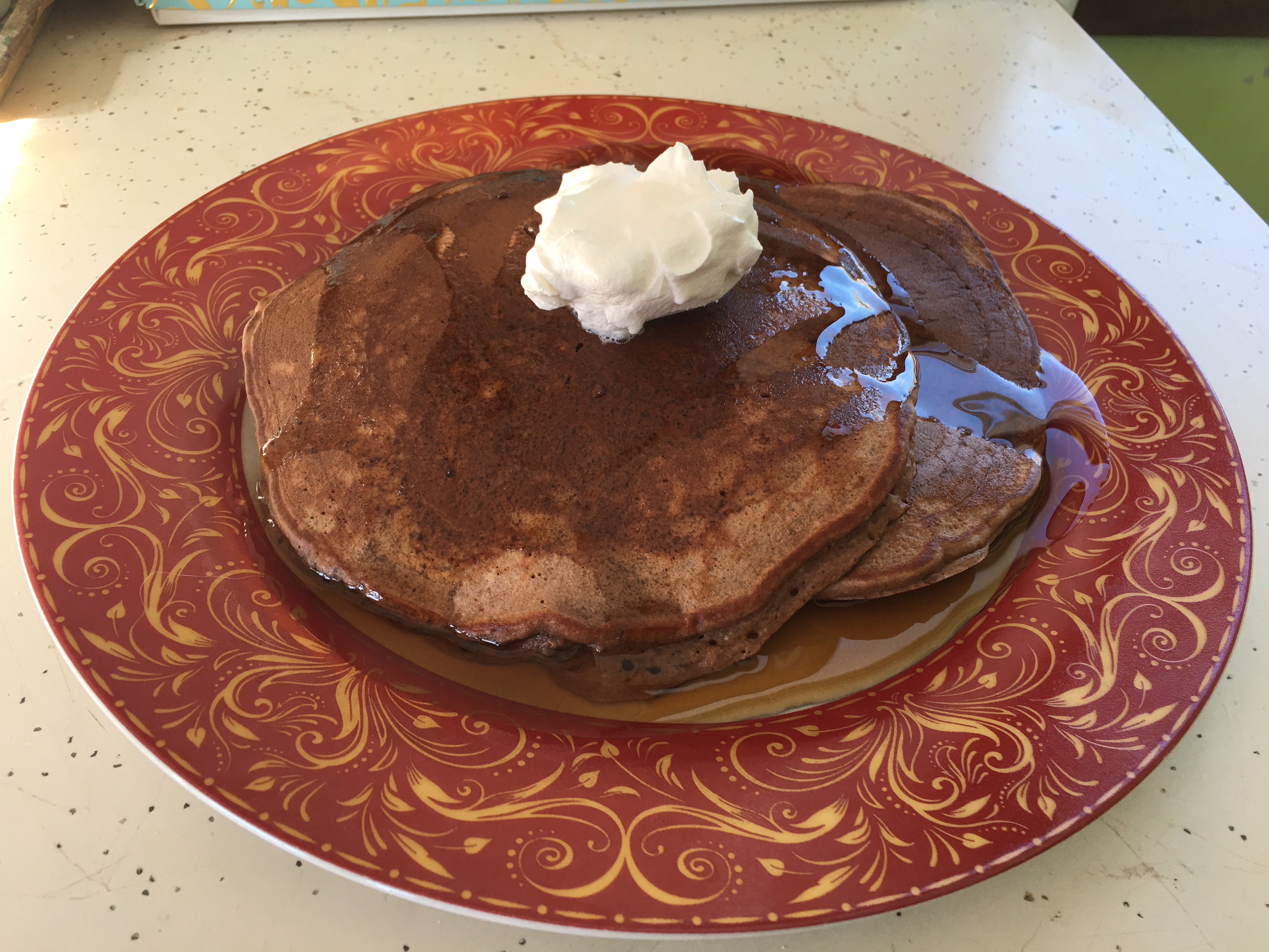 By the way, the pancakes are just the recipe from the Bisquick box, with about 1/4 cup of baking cocoa, a tablespoon of sugar, splash of vanilla, and a few chocolate chips thrown in.