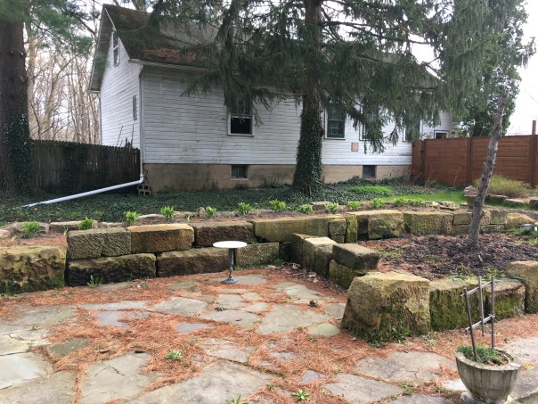 Yesterday we split enough hostas to fill the back of last year’s new raised bed. We also started lining the English ivy bed behind it with hosta.