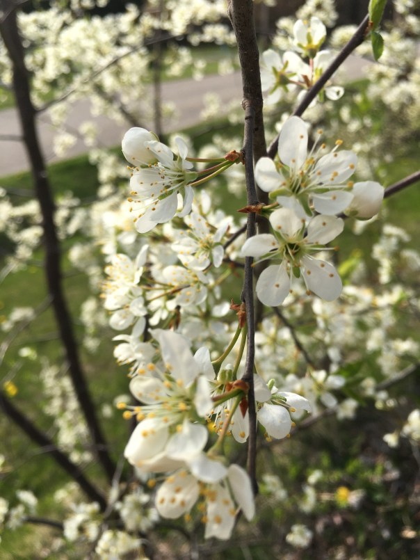 Then I sat on the patio and read, followed by a walk around the yard. The photos above are of my plum tree in bloom. We have yet to eat any plums from it. Despite being covered in blooms, it only yields two or three plums and the birds beat us to those.