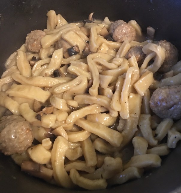 Our main course for dinner this evening was freshly homemade noodles with mushrooms and meatballs. (To make my portion vegetarian, I left out the meatballs and added a fried egg.) I added a side of broccoli to round out the meal.