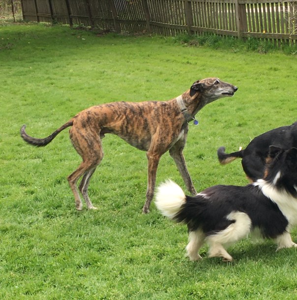 The reactive dog has shown improvement. It is just slow and ongoing. I have learned that if I go into the grass about four feet off the road, cars can pass without incident. Usually. This sometimes puts me in people’s front yards. I hope they don’t mind. It requires keeping a vigilant eye out for approaching vehicles in front of and behind us. I need to have ample time to get the required distance off the road, and must remain calm while doing so as not to insight a reaction