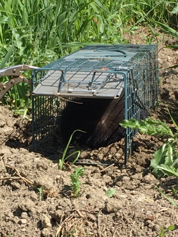 The larger trap turned out to be more problematic. We trapped a young skunk. I don’t think an adult skunk would fit, but this youngster did. He was probably an adolescent, judging by his size. Much discussion about what to do ensued. We opted not to relocate him because we didn’t want either of our vehicles to smell like skunk. We nixed a few other ideas and finally decided to just release him.