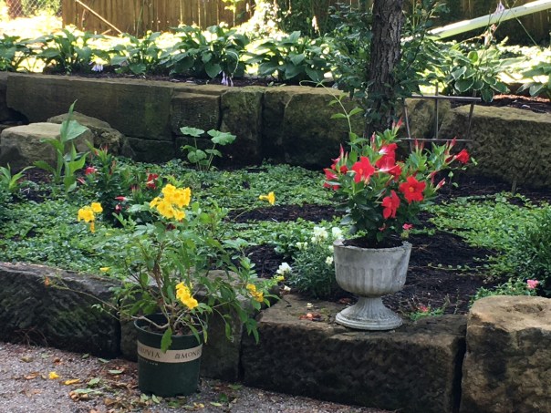 The key to great things is planning ahead. See that lily pad shaped plant in front of the back stone wall? It is a hollyhock. Hollyhocks are biennials and don’t bloom until their second year.