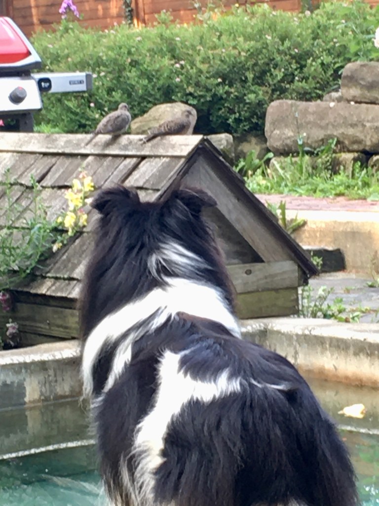 I am working on teaching the dogs not to chase the doves when they move around. It is going pretty well. I tell the dogs, these are our doves. If they move towards the doves, I tell the dogs “no no.” This is working well. Claire is our most active dog and likes to watch them. She likes to watch every thing. Even she usually leaves the birds alone at my request. They provide fine entertainment.