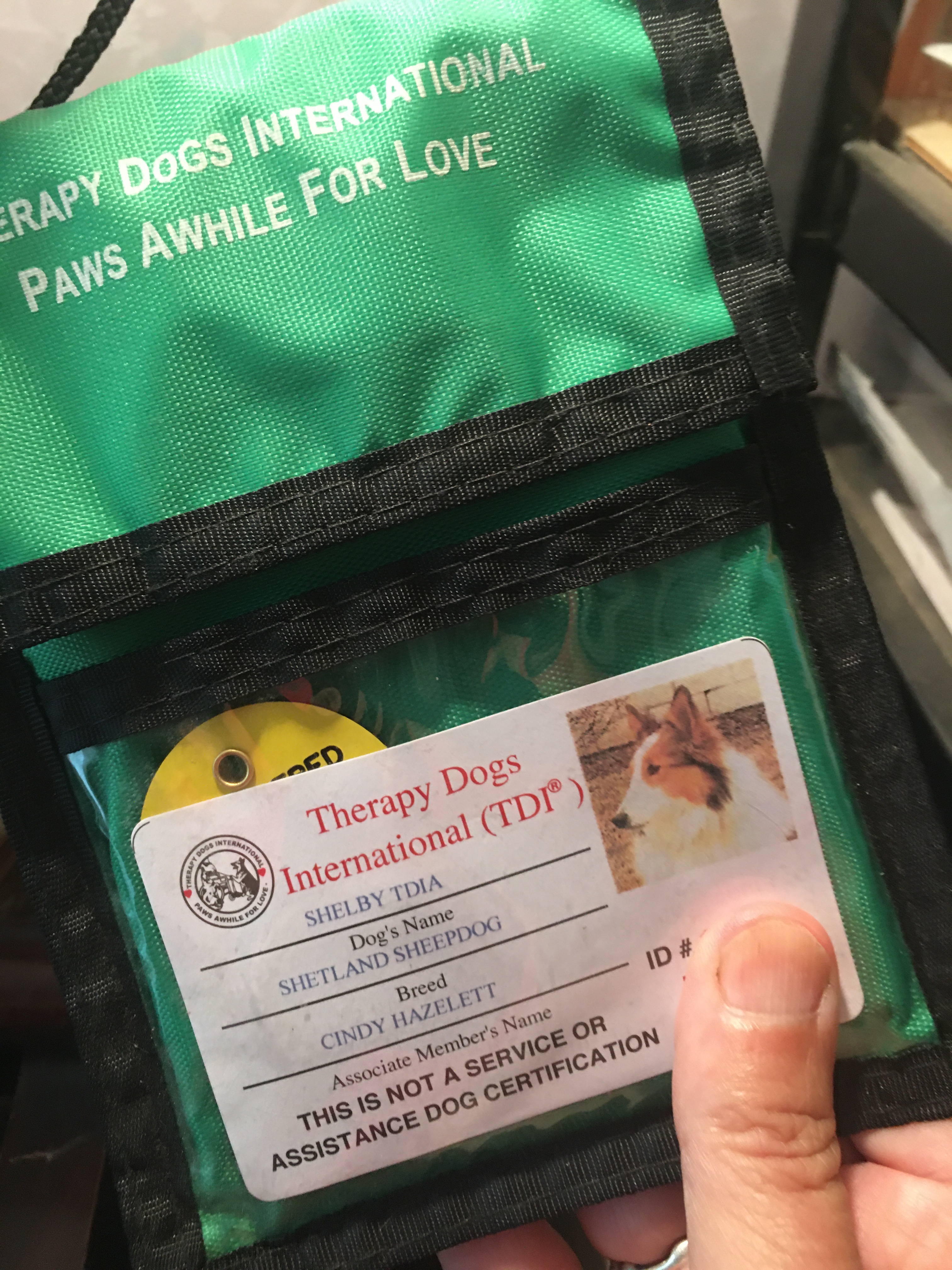 My dog Shelby is a certified therapy dog. This means she has passed a test indicating that she is qualified to visit nursing homes, assisted living facilities, hospitals, residential care facilities, hospice patients, and she can participate in “Read to a Dog” programs at libraries and schools. It also means that she exhibited a temperament that is suitable for such “work.” It is work, even though this is a volunteer position and cannot be done for money, as certified by the organization we are members of.