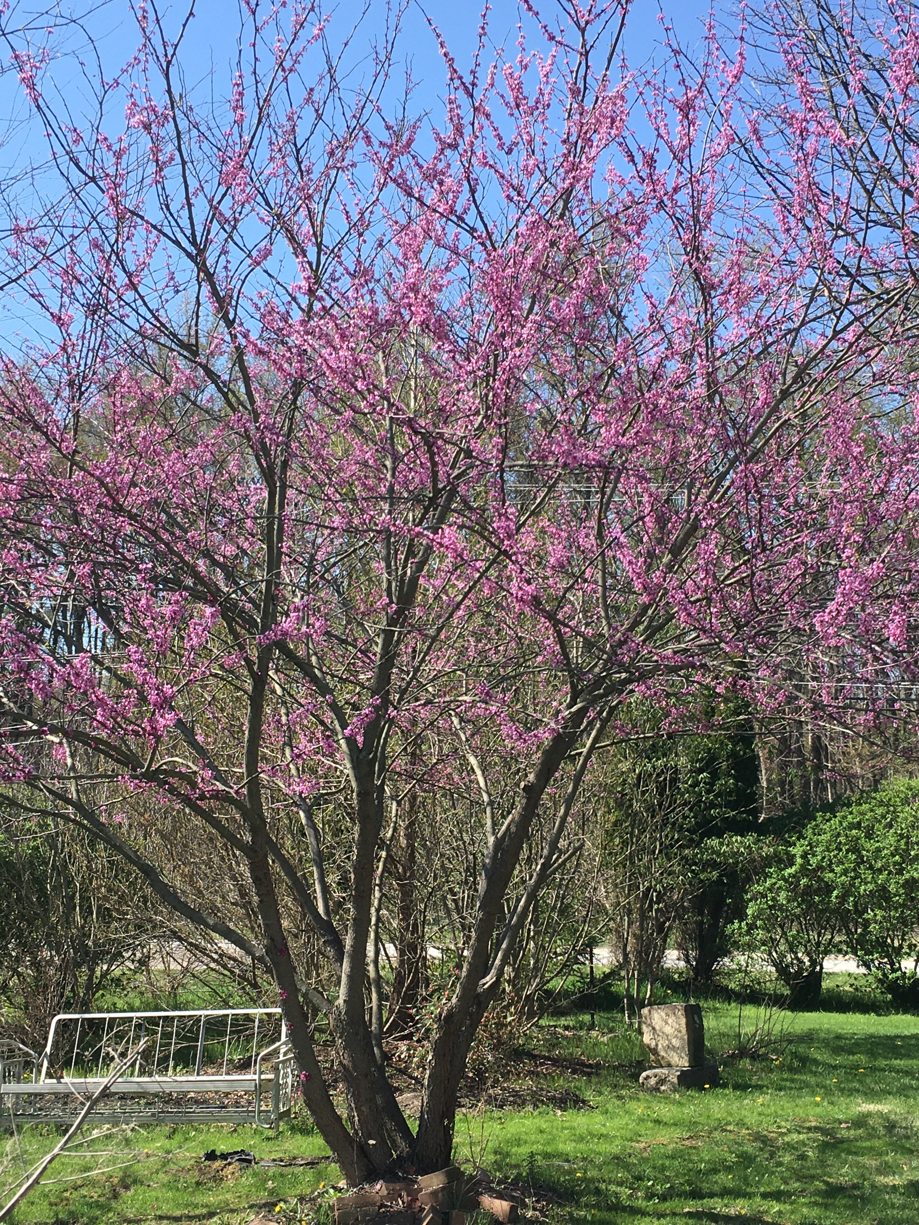 Above is a group of three redbud trees. We planted them together several years ago until they grew bigger, thinking of the group as a tree nursery. Well, we never got around to moving them and now it’s too late. The trees seem happy though and we are happy with the arrangement too, so all is well. We find several redbud seedlings a year that have made a good start. A few we have transplanted to better locations. We happily give an occasional one away, free to a good home once they reach about a foot tall.