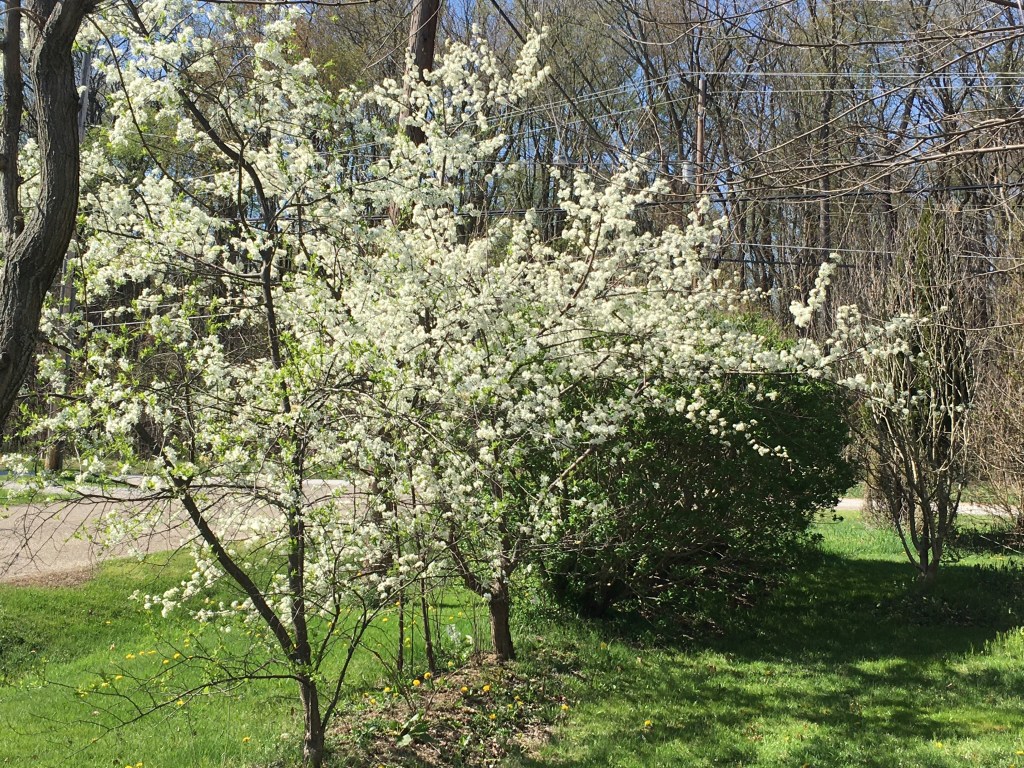 Things in our yard are starting to green up too. Hubby just mowed for the first time, and I think our yard looks like a park. The major things in bloom for us right now are fruit trees and bushes. We have American plums, a Methley plum, and another type of Japanese plum that I can’t recall the name of. We have learned that you need two types of Japanese plums for them to pollinate and bear fruit. You can’t for instance have only two Methley plum trees and have them fruit. They must be different types. The American plums may pollinate the Japanese plum trees, but only if they flower at the same type which is apparently not guaranteed. We also have two cherry trees. One we planted last summer. The other is an old tree that has been here longer than I have. All its cherries grow in the top canopy where only the birds can reach them. We also have five blueberry bushes. They performed well last year for being so young and we hope for a good crop this year. We also have random black raspberry bushes around the property. They reseed themselves so we never know just how many or where they will be.