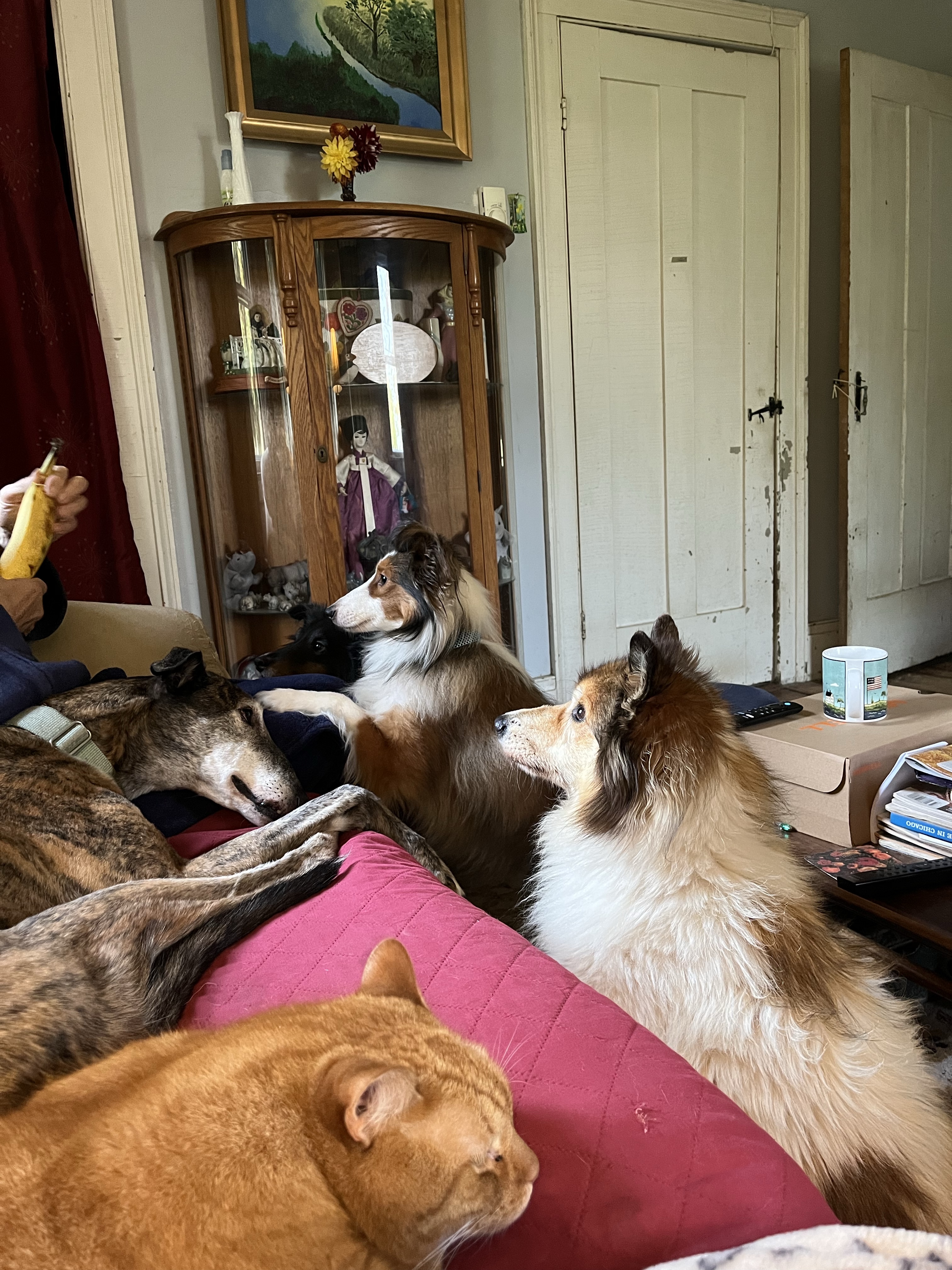 PeeWee has learned to join the others in begging at their favorite time of day. Banana time! He takes his portion so gently! Our dogs love few foods more than bananas. Each dogs gets two bites. Everybody gets one bite and then there is round two where each dog gets a second bite. Cassius the greyhound can count to two and lays down once he has had his second bite. The others are eternal optimists and never give up. Daddy only ever gets to eat half of a banana due to the popularity of this routine. Woe be unto me if I let the banana supply run out!