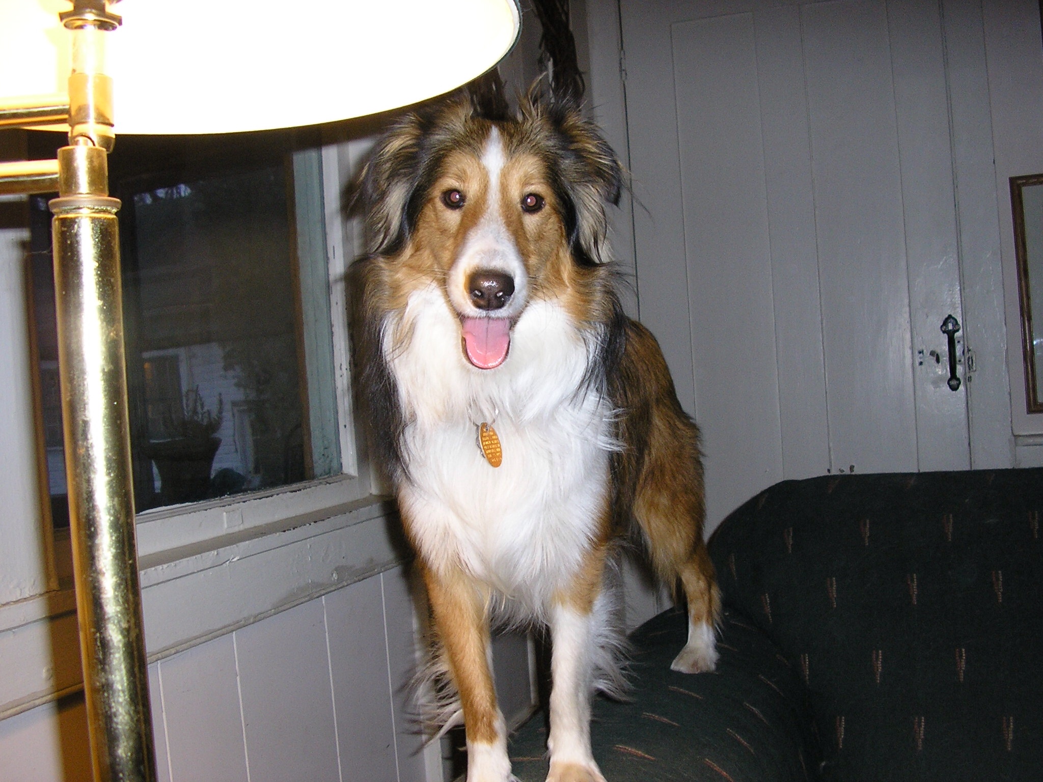 Foster sheltie Claire hanging out with the big guy, our resident greyhound. The angle of the photo is deceptive. Claire weighs 27 lbs. to Cassius’ 72.