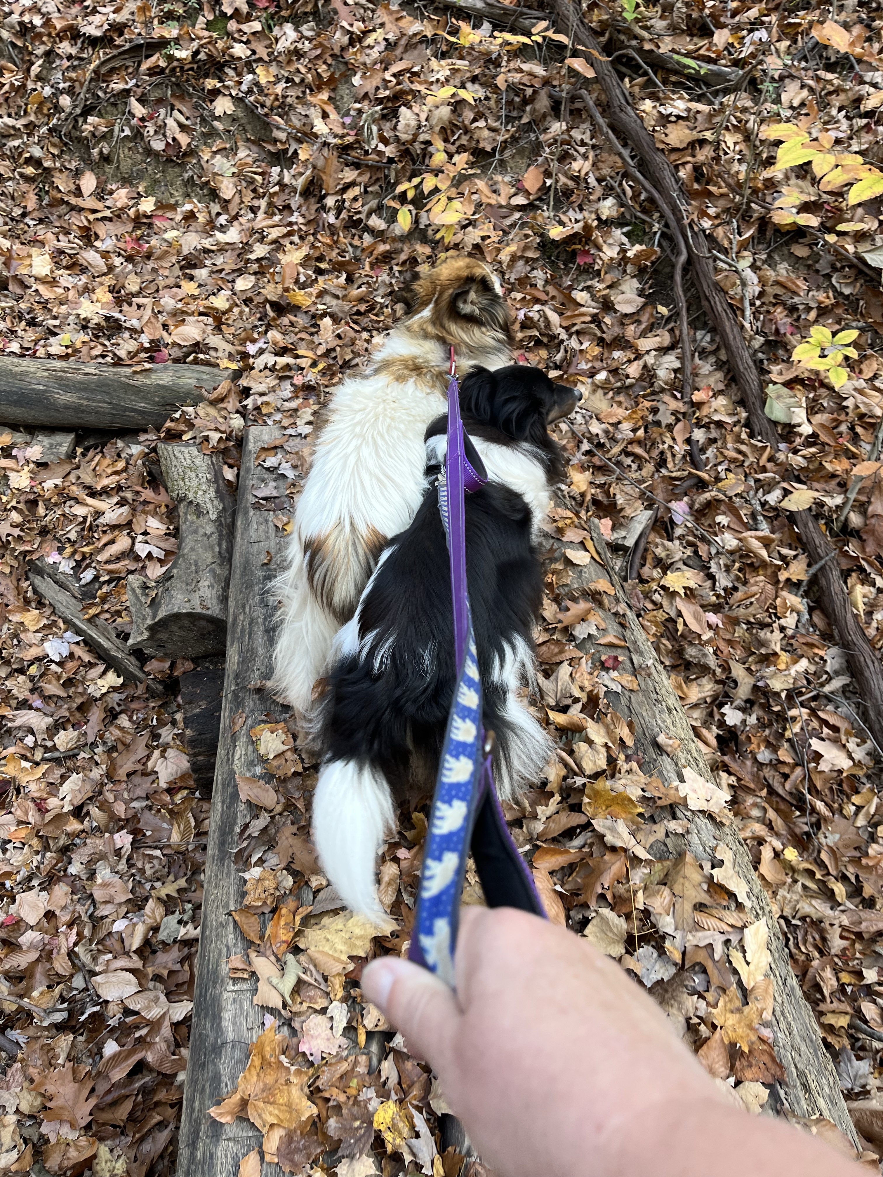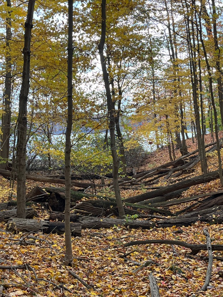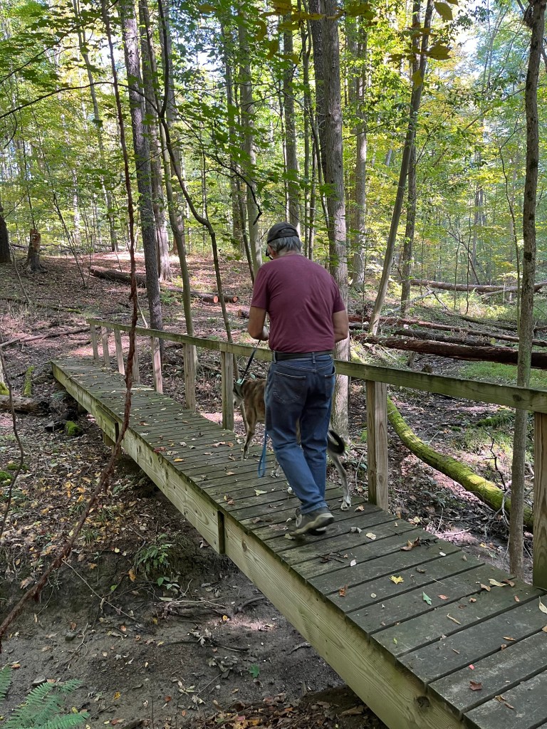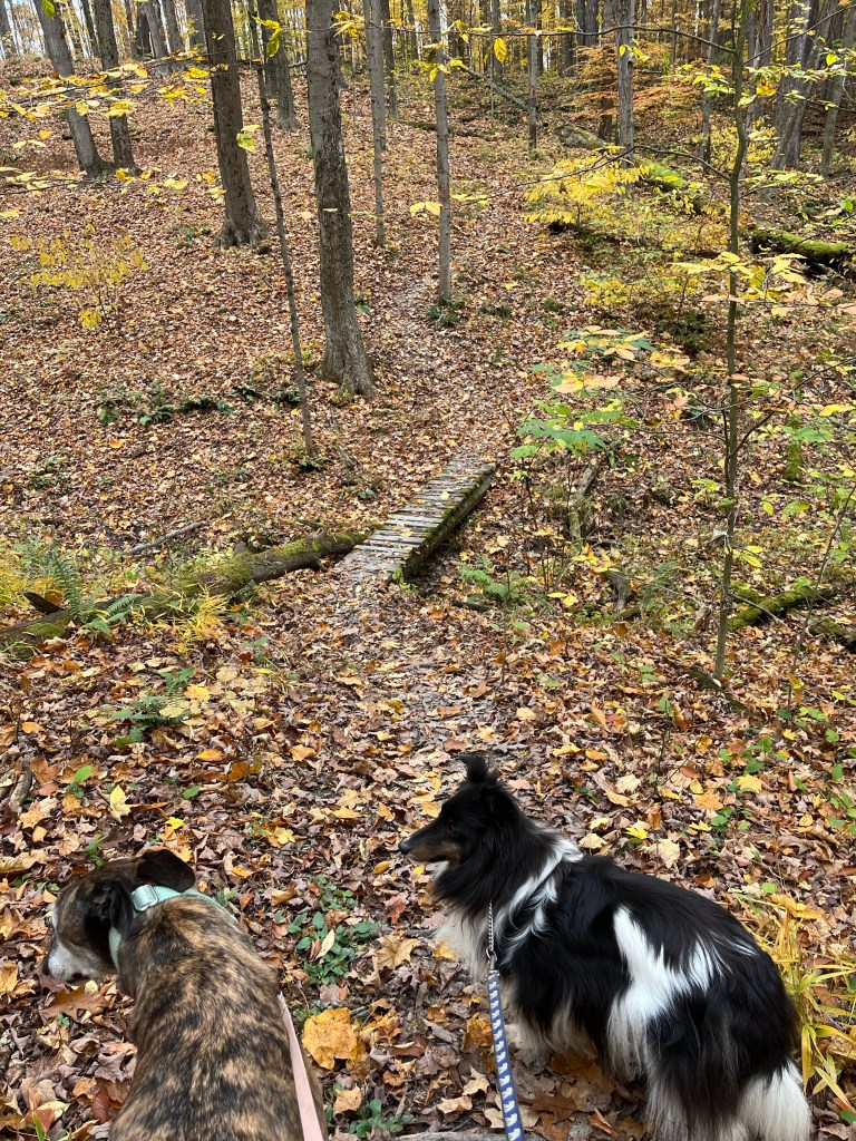 Another reason for my love of fall? The air is crisp and refreshing without the cloying heat of summer. It is the perfect weather for hiking. Fall is jacket time, and they are easily shed when you get too hot on the trail. Then you are quite comfortable and can concentrate on the beauty all around you. We often hike near bodies of water: lakes, ponds, and reservoirs. The photo above is from our hike this morning. I requested we hike on this particular trail this morning for the color contrast between the leaves and water that I knew would be there. It did not disappoint. (Wild Cherry Trail, West Branch State Park, Ohio) The trail is only one mile long, but I always think it seems farther. There are ups and downs, many tree roots popping up in the trail, and so much to see. I would rate it as moderately difficult. Our dogs had a blast as did we. Shelby stayed home but the other four went along. Cassius the greyhound and PeeWee the tiny sheltie is just in front of my husband. Zekie and Claire walk with me. Zekie was wearing his new llama sweater as his fur has thinned with the Cushing’s Disease. I think he rocks it!