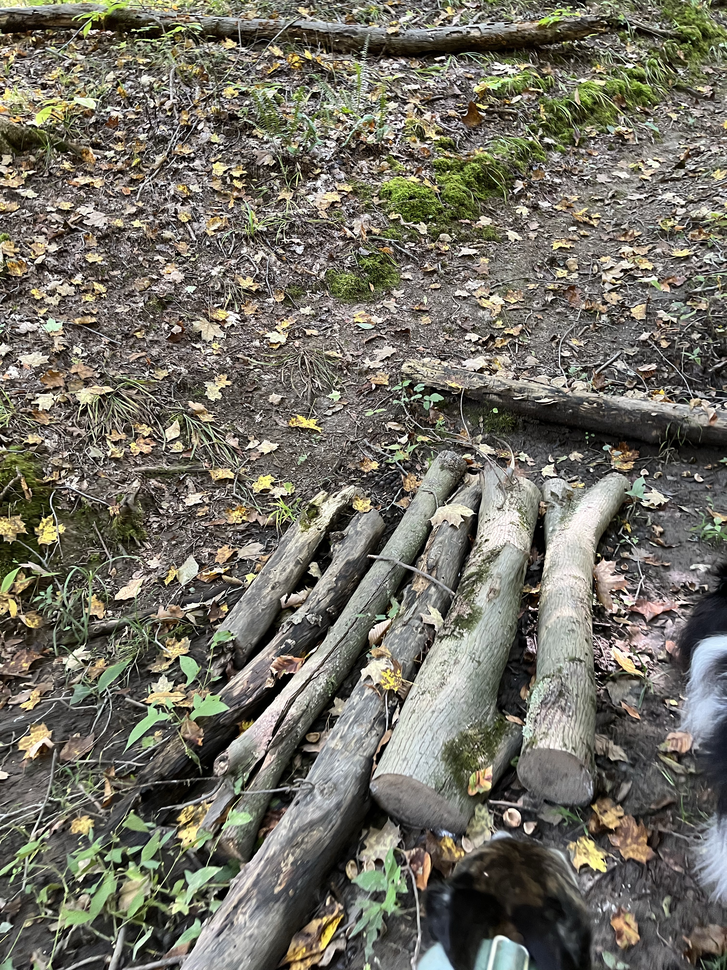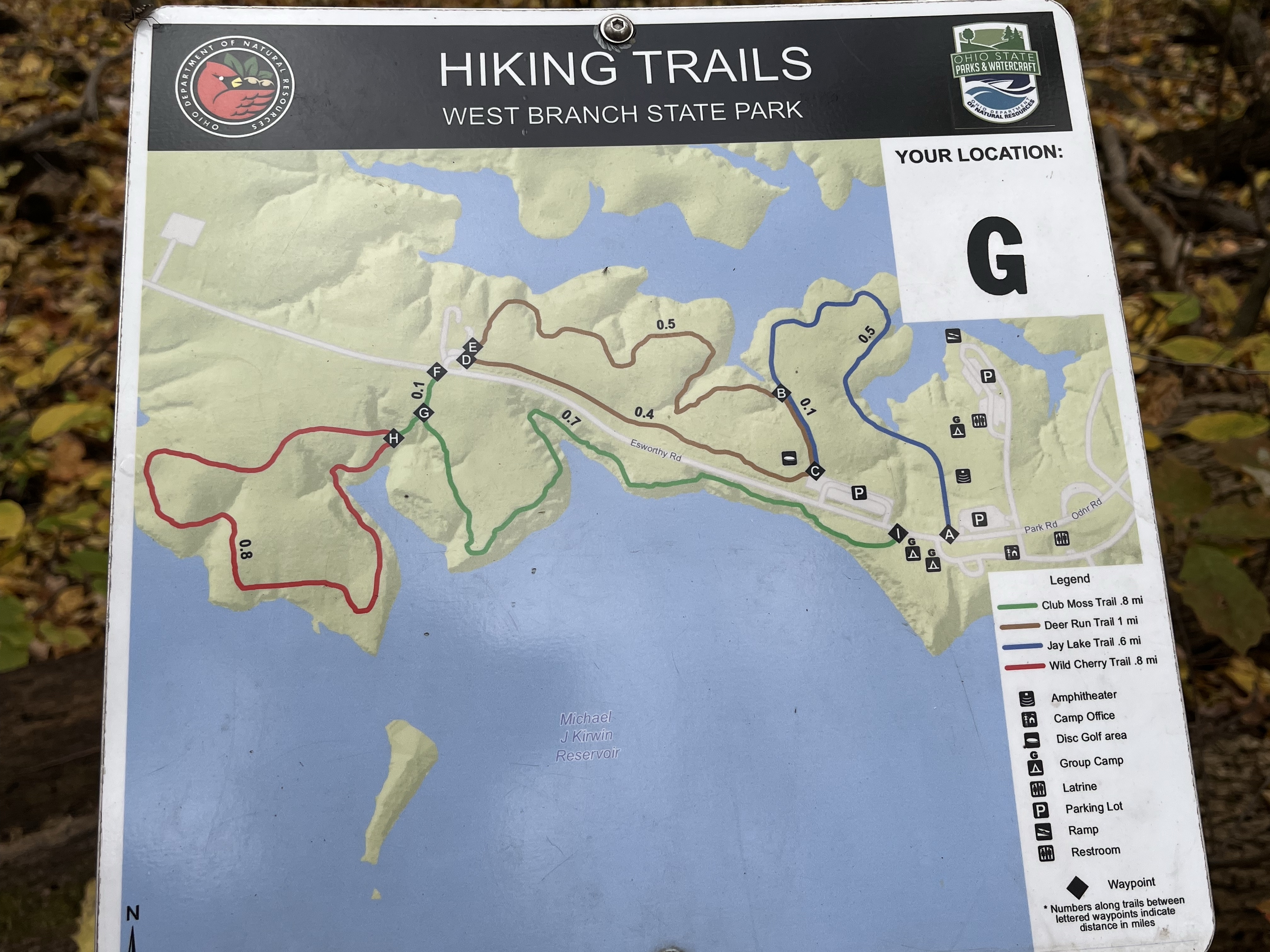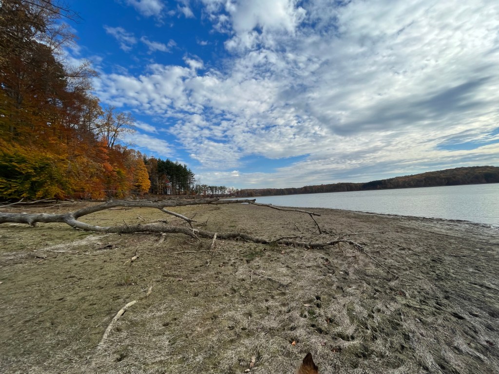 Another reason for my love of fall? The air is crisp and refreshing without the cloying heat of summer. It is the perfect weather for hiking. Fall is jacket time, and they are easily shed when you get too hot on the trail. Then you are quite comfortable and can concentrate on the beauty all around you. We often hike near bodies of water: lakes, ponds, and reservoirs. The photo above is from our hike this morning. I requested we hike on this particular trail this morning for the color contrast between the leaves and water that I knew would be there. It did not disappoint. (Wild Cherry Trail, West Branch State Park, Ohio) The trail is only one mile long, but I always think it seems farther. There are ups and downs, many tree roots popping up in the trail, and so much to see. I would rate it as moderately difficult. Our dogs had a blast as did we. Shelby stayed home but the other four went along. Cassius the greyhound and PeeWee the tiny sheltie is just in front of my husband. Zekie and Claire walk with me. Zekie was wearing his new llama sweater as his fur has thinned with the Cushing’s Disease. I think he rocks it!