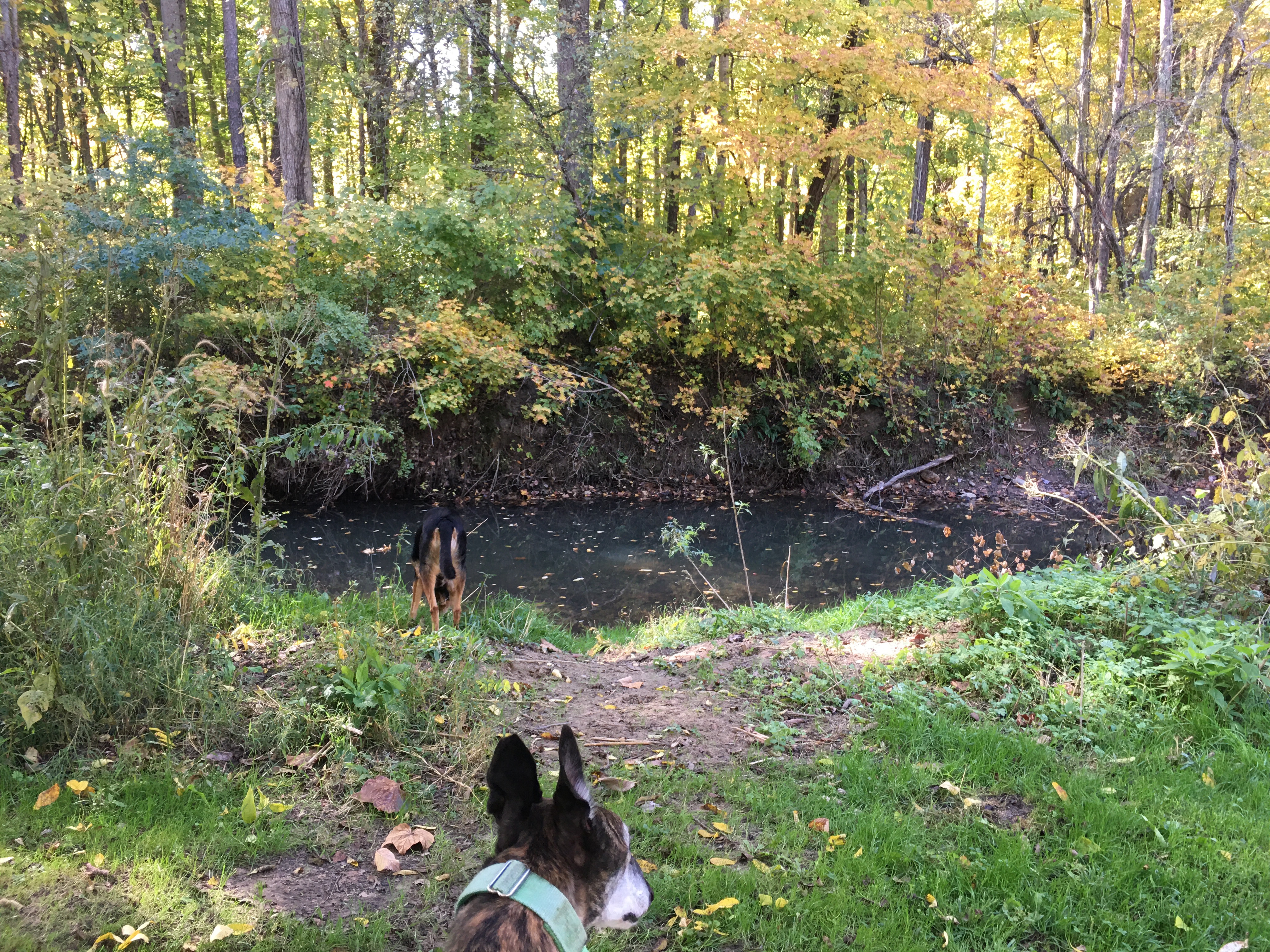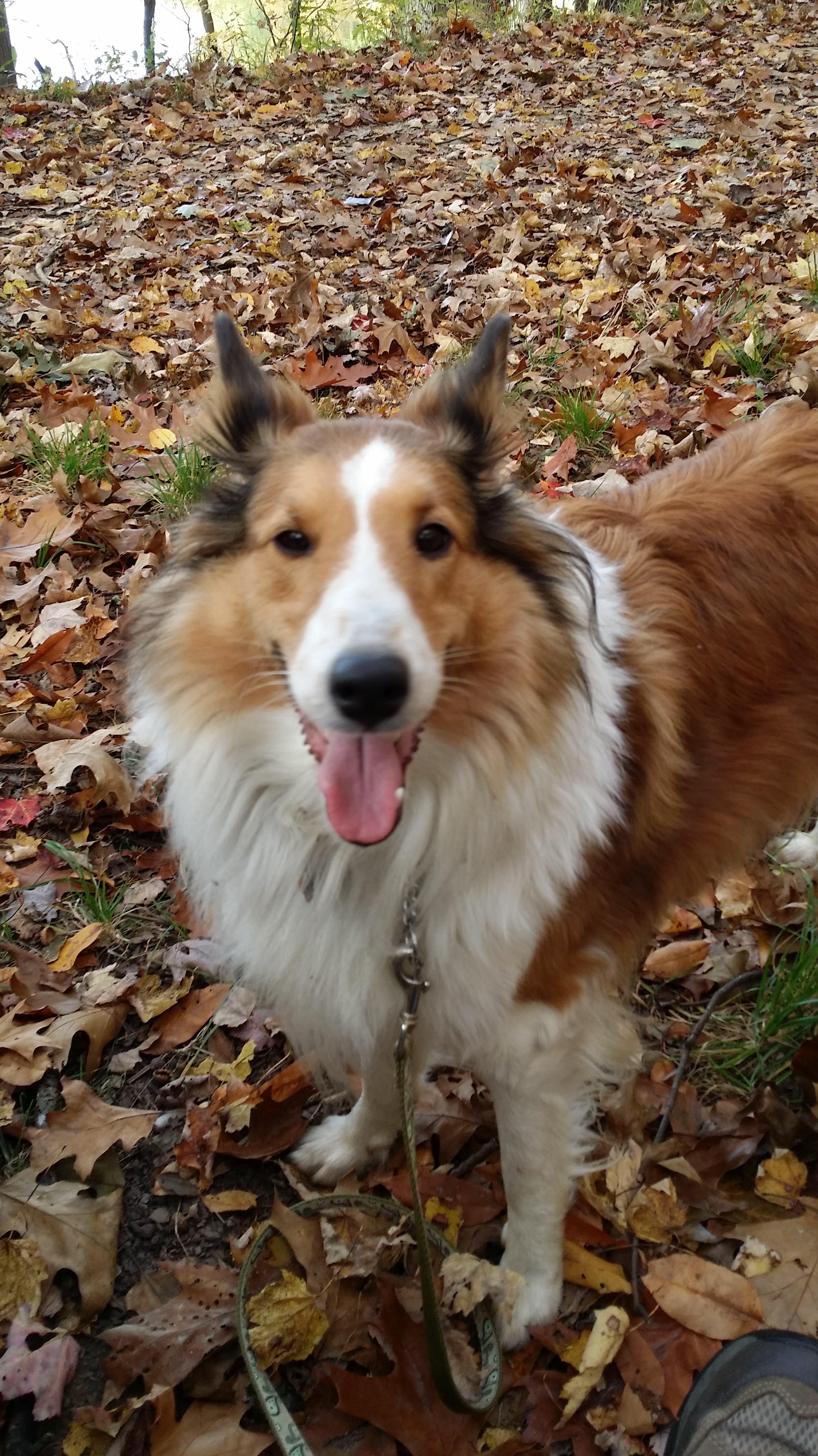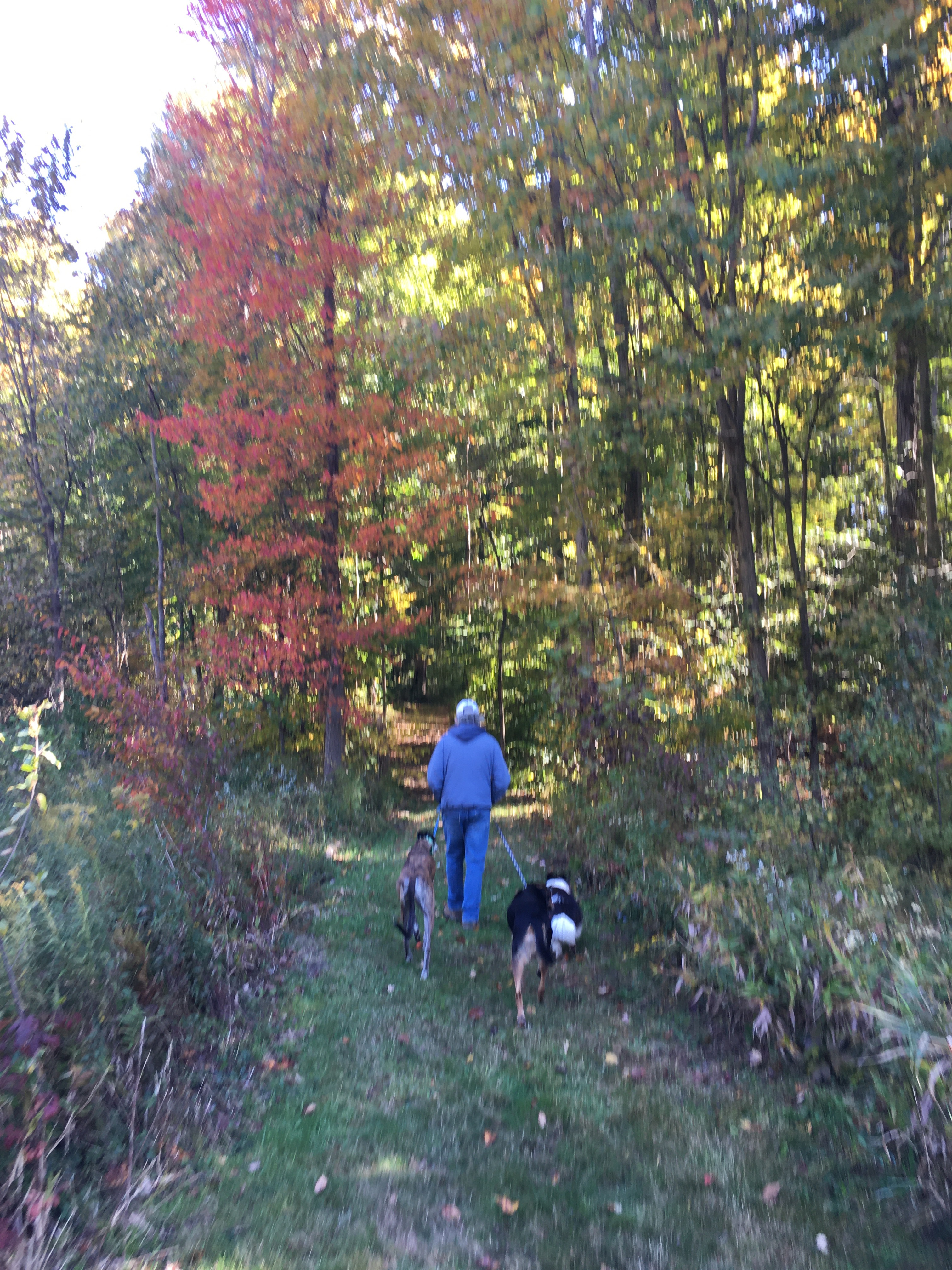 Another reason for my love of fall? The air is crisp and refreshing without the cloying heat of summer. It is the perfect weather for hiking. Fall is jacket time, and they are easily shed when you get too hot on the trail. Then you are quite comfortable and can concentrate on the beauty all around you. We often hike near bodies of water: lakes, ponds, and reservoirs. The photo above is from our hike this morning. I requested we hike on this particular trail this morning for the color contrast between the leaves and water that I knew would be there. It did not disappoint. (Wild Cherry Trail, West Branch State Park, Ohio) The trail is only one mile long, but I always think it seems farther. There are ups and downs, many tree roots popping up in the trail, and so much to see. I would rate it as moderately difficult. Our dogs had a blast as did we. Shelby stayed home but the other four went along. Cassius the greyhound and PeeWee the tiny sheltie is just in front of my husband. Zekie and Claire walk with me. Zekie was wearing his new llama sweater as his fur has thinned with the Cushing’s Disease. I think he rocks it!