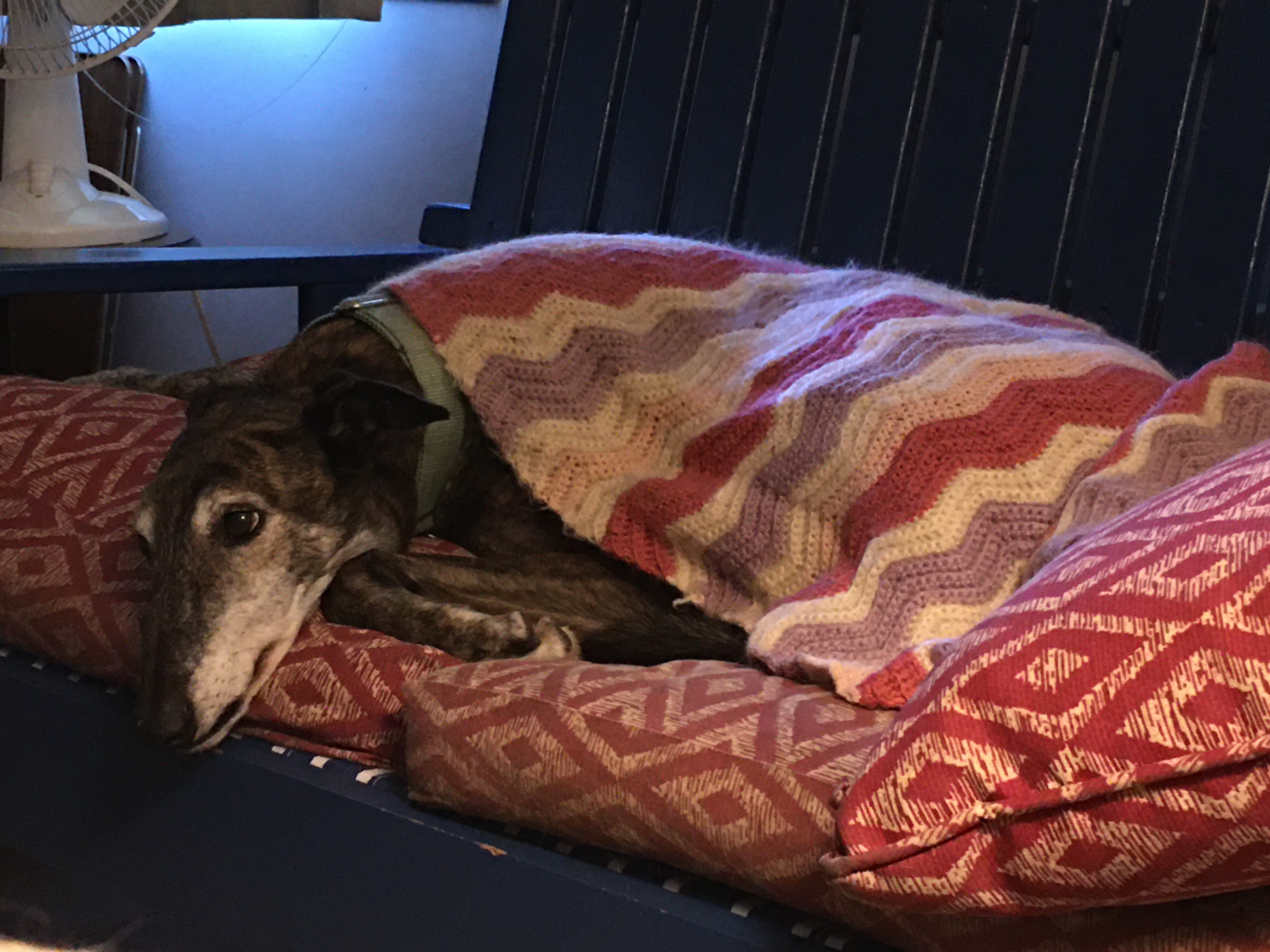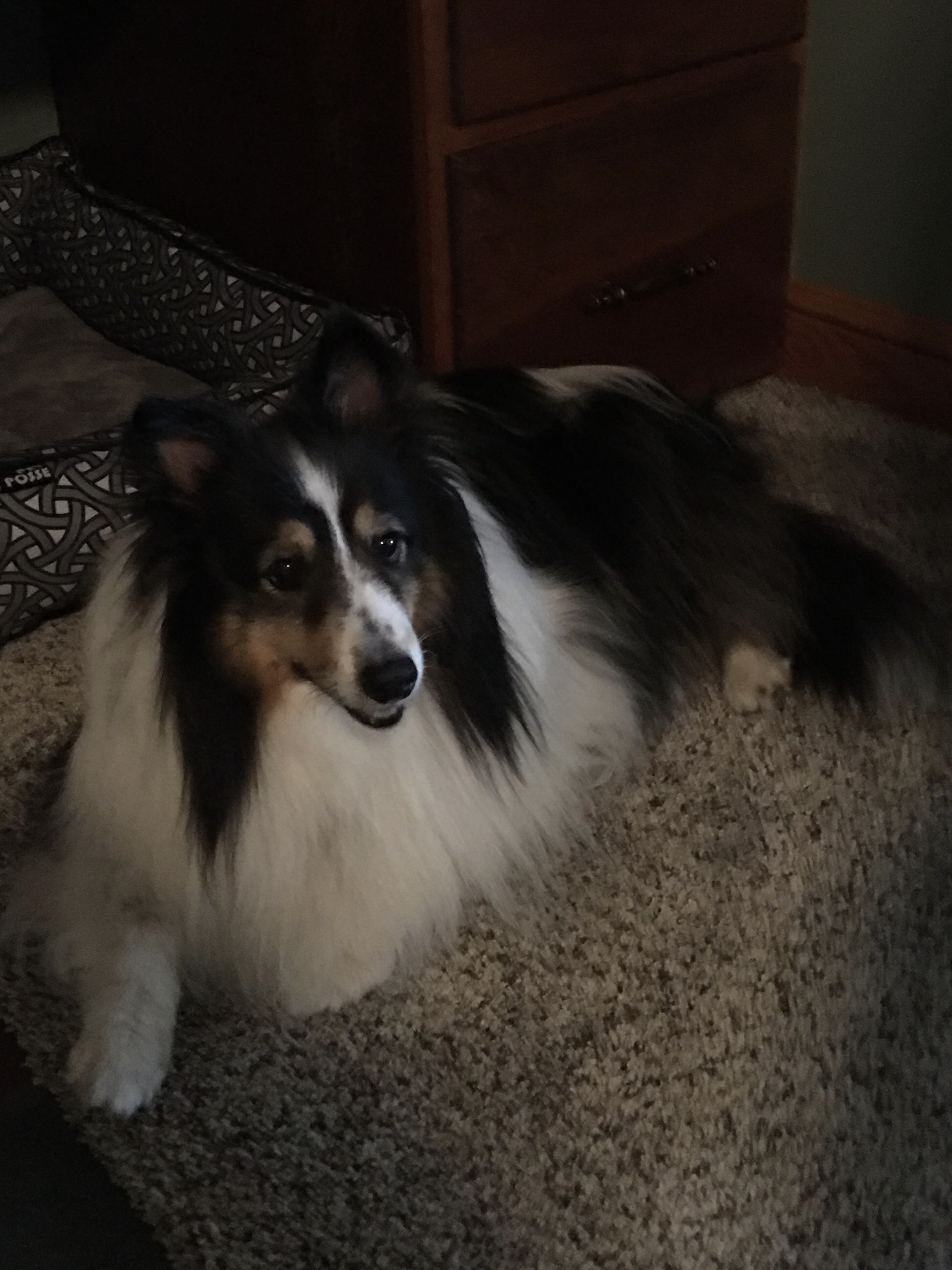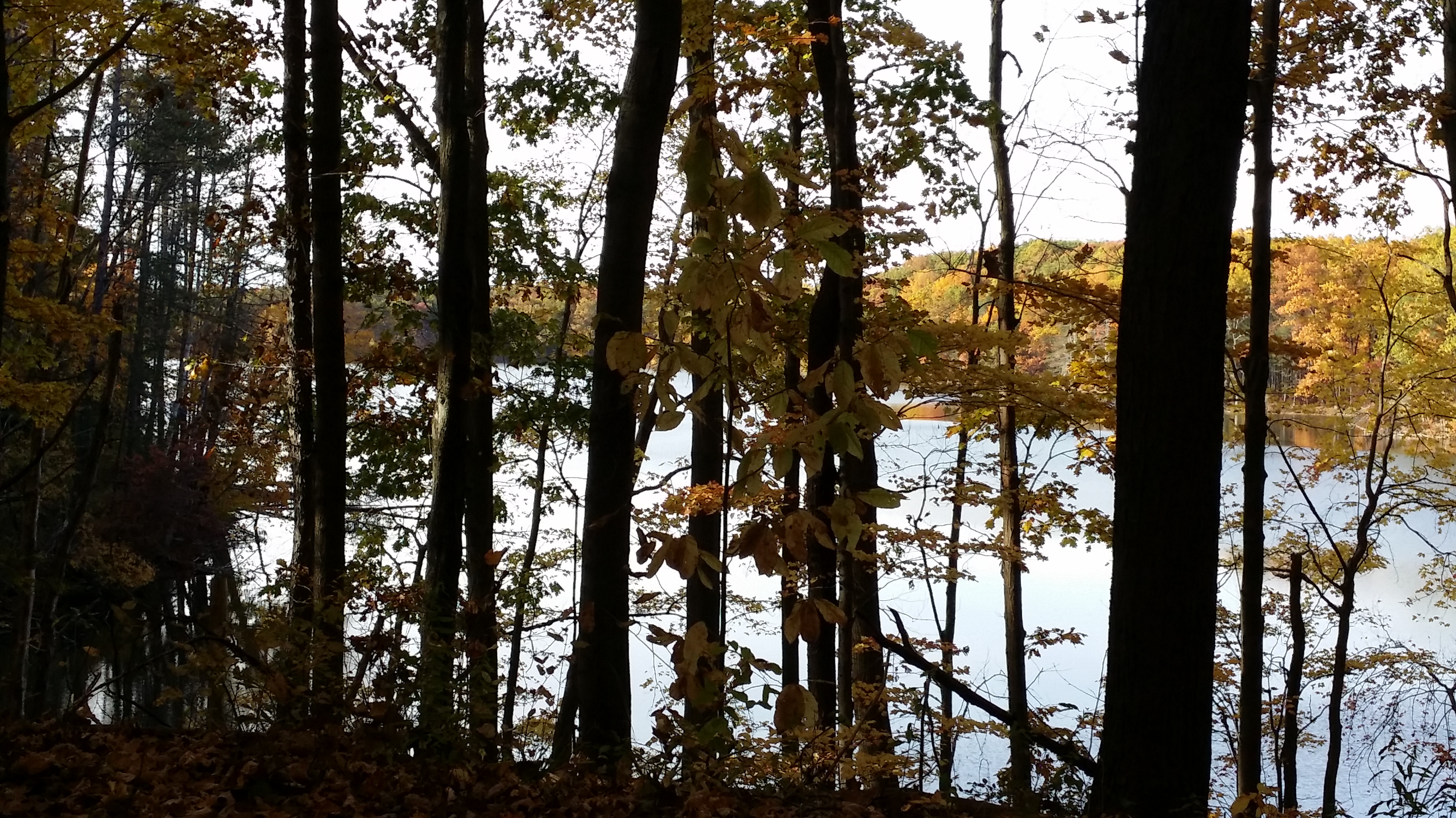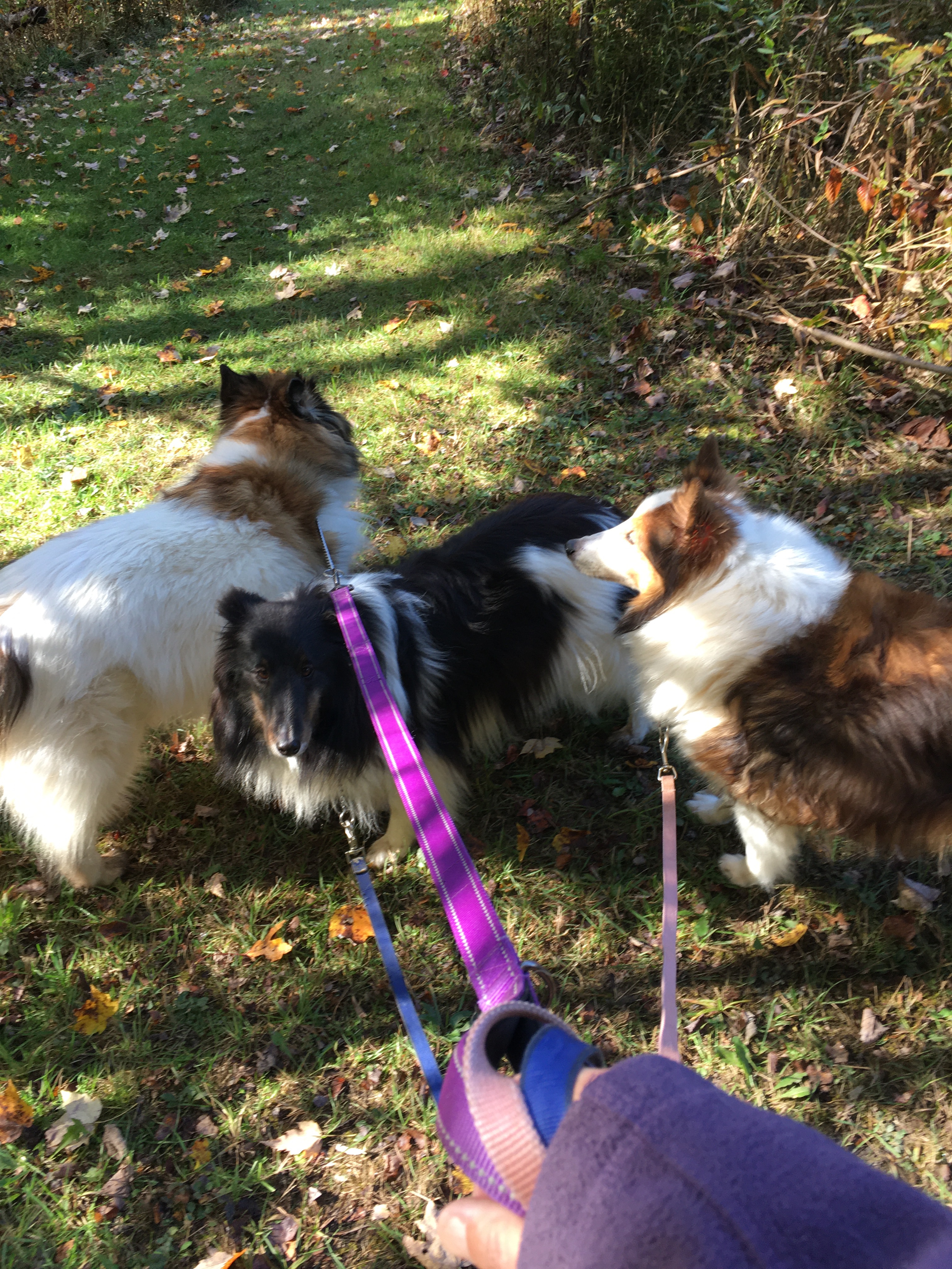 Another reason for my love of fall? The air is crisp and refreshing without the cloying heat of summer. It is the perfect weather for hiking. Fall is jacket time, and they are easily shed when you get too hot on the trail. Then you are quite comfortable and can concentrate on the beauty all around you. We often hike near bodies of water: lakes, ponds, and reservoirs. The photo above is from our hike this morning. I requested we hike on this particular trail this morning for the color contrast between the leaves and water that I knew would be there. It did not disappoint. (Wild Cherry Trail, West Branch State Park, Ohio) The trail is only one mile long, but I always think it seems farther. There are ups and downs, many tree roots popping up in the trail, and so much to see. I would rate it as moderately difficult. Our dogs had a blast as did we. Shelby stayed home but the other four went along. Cassius the greyhound and PeeWee the tiny sheltie is just in front of my husband. Zekie and Claire walk with me. Zekie was wearing his new llama sweater as his fur has thinned with the Cushing’s Disease. I think he rocks it!