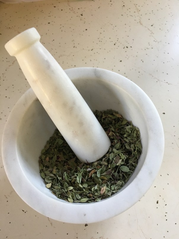 Autumn is a flurry of chores to wind up the growing season. There was putting the vegetable garden to bed and now I am processing herbs that I recently harvested. I cut and dried thyme, oregano, and chives. These are perennials. Once they are dried, I strip the leaves off the stems and grind them up with my mortar and pestle. I store them for use throughout the winter.