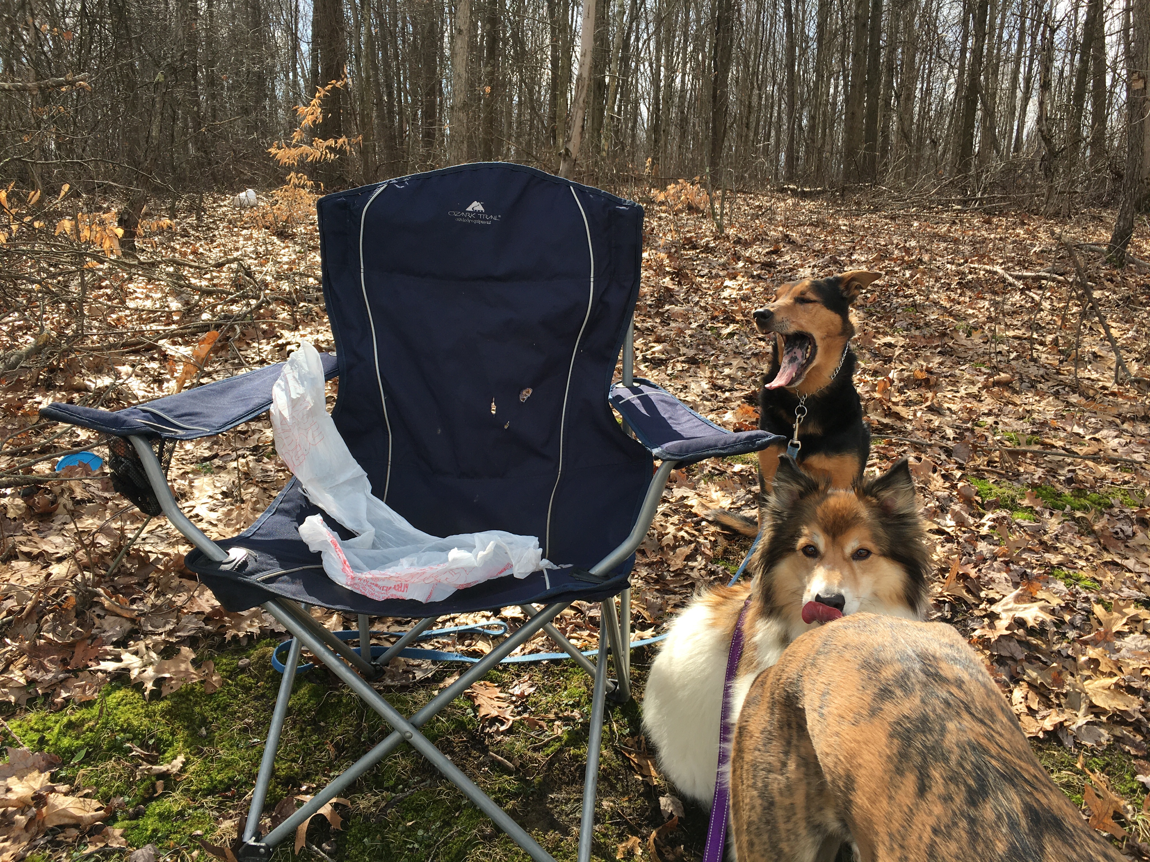 The first side trail we took involved fording a small stream. I was wearing my waterproof hiking boots and there were rocks in the shallow stream bed, so it wasn’t too bad. We made our way to the end of a little peninsula and found the area to be well used. I even found this chair that someone had left behind, upturned to keep the seat clean. I covered it with a plastic bag since it was damp from a morning rain and sat in it while I ate my lunch. Unfortunately for me, (fortunate for Zekie), I dropped half of my piece of leftover frozen pizza while leaning forward to get a picture of some geese. See below. I couldn’t really blame Zekie, I did drop the pizza on the ground. Since Zekie had a snack, I felt the need to give the other two dog biscuits. I put the chair back as I had found it before we left, so the next hiker can enjoy it too.