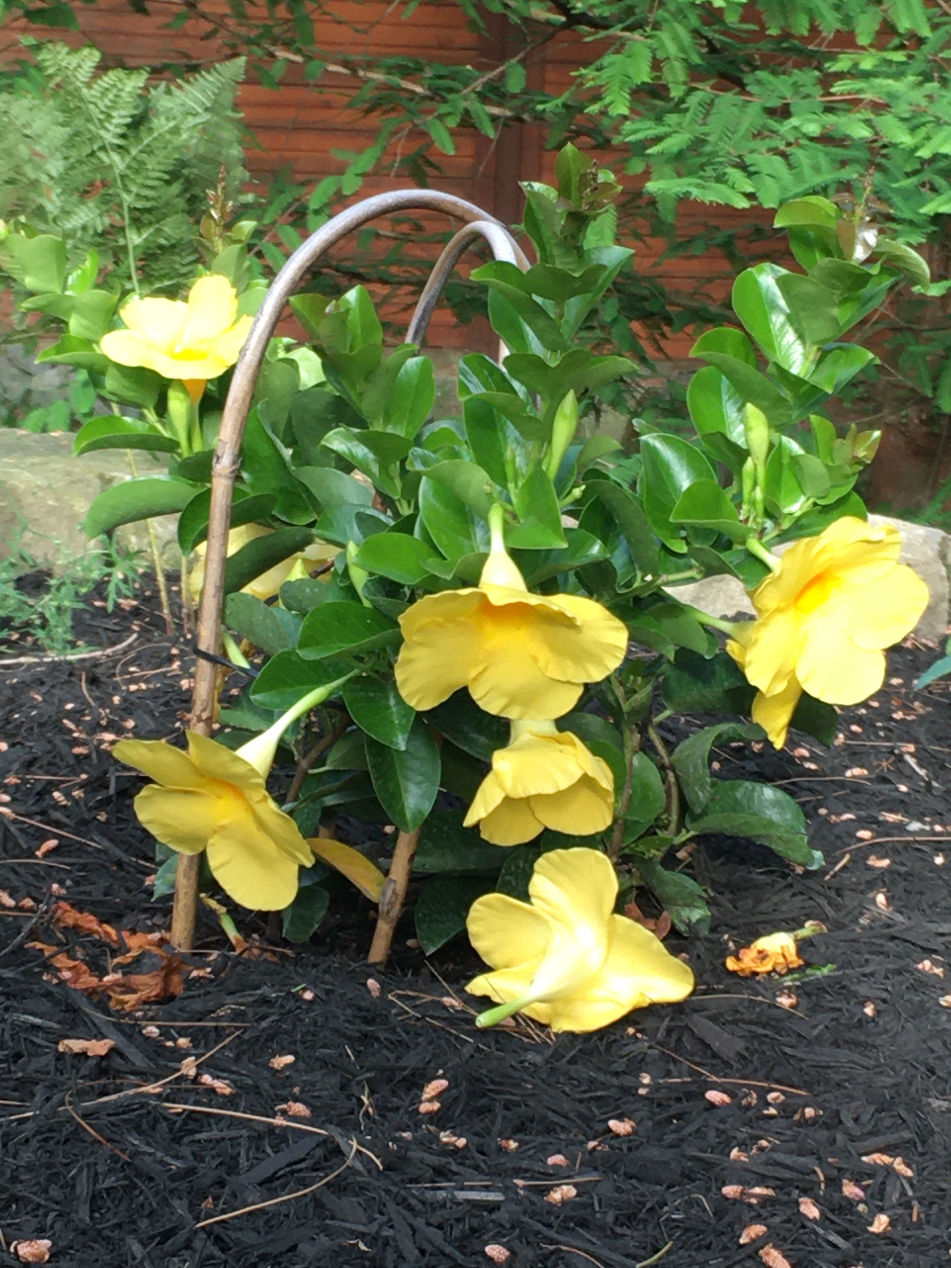 I no longer remember what variety of clematis this is. We have two types and this one blooms first. It blooms heavily and for a long time. Then it rests a little while and gives another round of blooms. I recently learned that you are supposed to prune clematis. Before that I had no idea, so this one never had been. It is a monster in size, with roots growing up to a couple feet away from where the original roots where planted. I found one entirely new rootling and separated it to plant on my rose trellis since the rose is having an off year. I’m sure there are other rootlings in there to if I look for them amongst the jungle of stalks. I cut some dead stems from this plant late last fall. I don’t know that I will trim it anymore than that since this plant has always provided us hundreds of blooms. Why mess with a good thing?