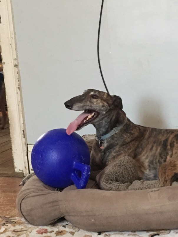 Zekie doesn’t need to go in his crate if one of us is still home. He just gets forlorn, not destructive as long as someone is there. When he becomes aware that someone will be leaving in a minute, he grabs a bone or toy and tries to entice the person to play instead of going out the door. If that doesn’t work, he can even chomp the bone at you and bark with it in his mouth. You can tell he’s saying, “wouldn’t you rather play with me and have this bone than go away?”