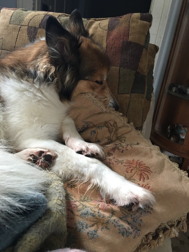 This is Zeke shortly after we returned from our walk and training. When the lady stopped in the van, he wasn’t sure if this was ok or if he should protect me. I told him it was alright and as the lady and I talked, Zeke relaxed. He was a good boy. This was a relief because he can sometimes be reactive to people or dogs that he does not know. But his response this time was just right. All the activity and decision making apparently wore him out. He needed a nap, so crashed on the living room couch with his head on the pillow.